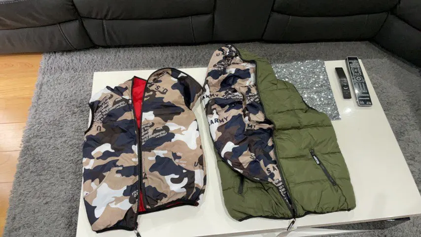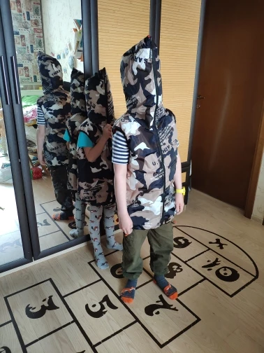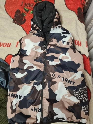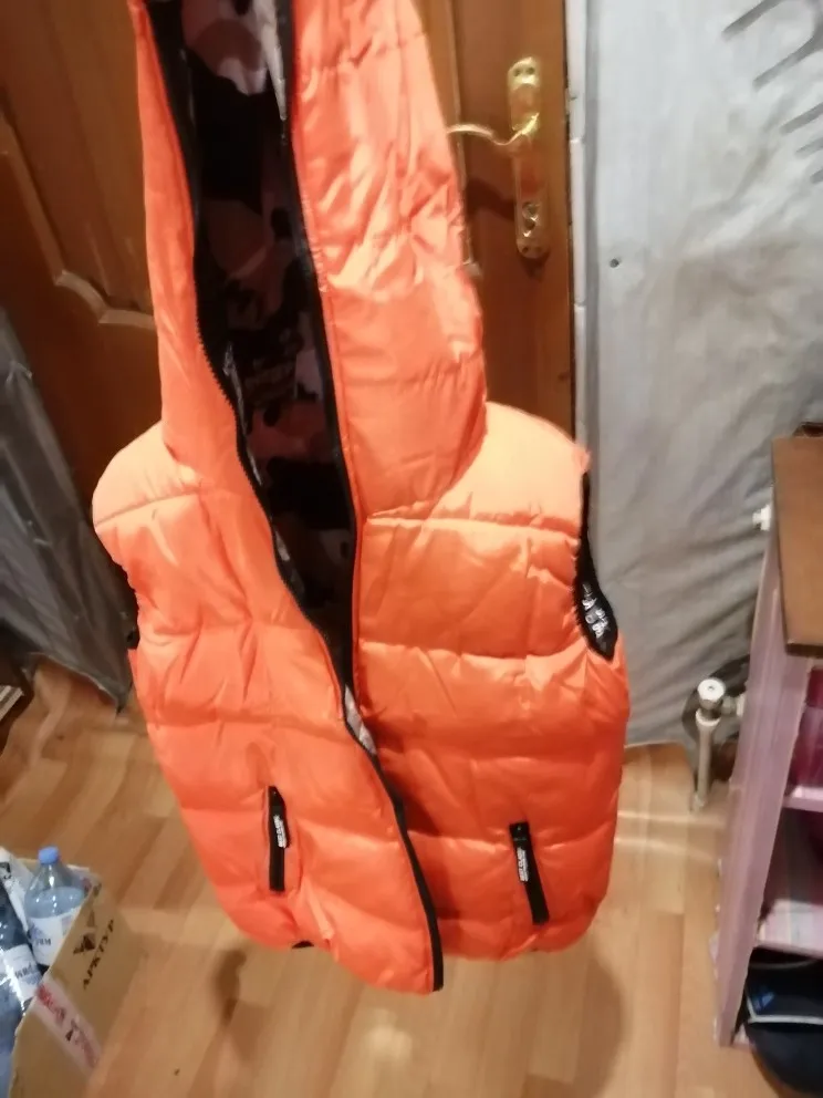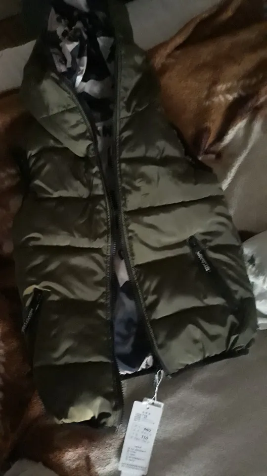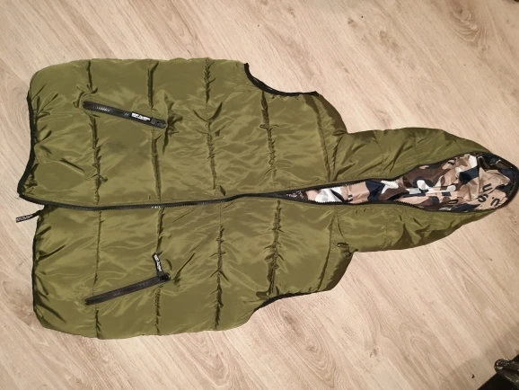 жилетка без единого ярлыка. ни рост ни состав ни уход ничего нет. наполнитель типа синтепон. брала на мальчика ростом 135. с толстовкой должна хорошо сидеть. сторона милитари видно что изнаночная карманы там попроще и нитки оранжевые просвечивают во многих местах. за свои деньги очень даже ничего. нитки кое-где торчат но не критично. в пятёрочку в Екатеринбурге шла 2 недели