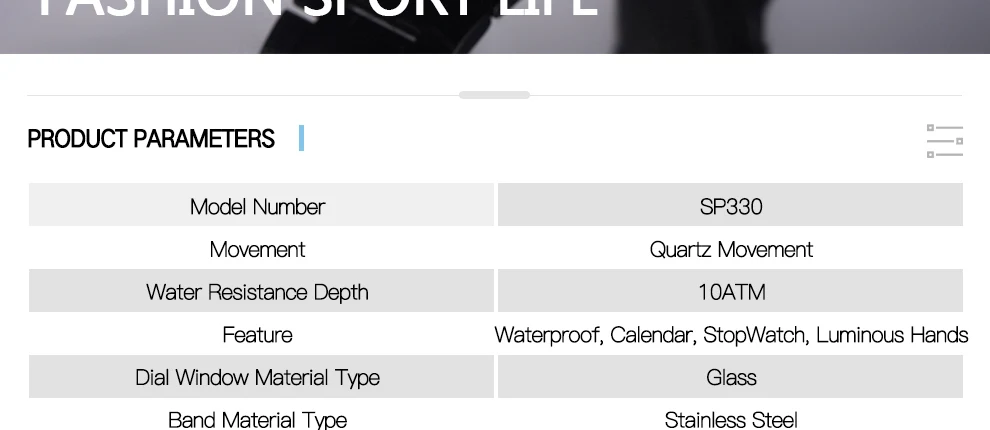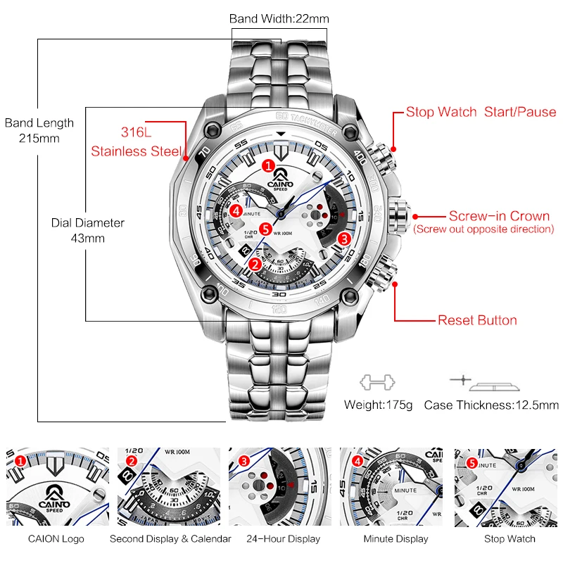 Модель: CAINO SP330Стиль: спорт, мода и бизнесМеханизм: кварцевый механизм Основная особенность:Высокое соотношение цены и качестваЧехол из нержавеющей стали 316LРемешок из нержавеющей стали 316LСветящиеся стрелкиСкрытая застежка с кнопкой10 бар Спецификация (приблизительная):Общая длина: 215 ммЧехол Диаметр: 43 ммЧехол Толщина: 12,5 ммШирина ремешка: 22 ммВес изделия: 175 г
