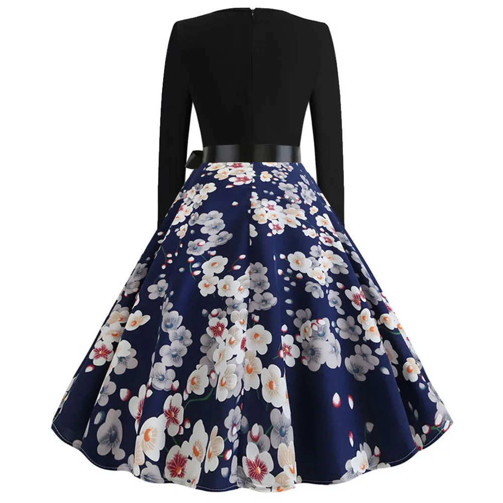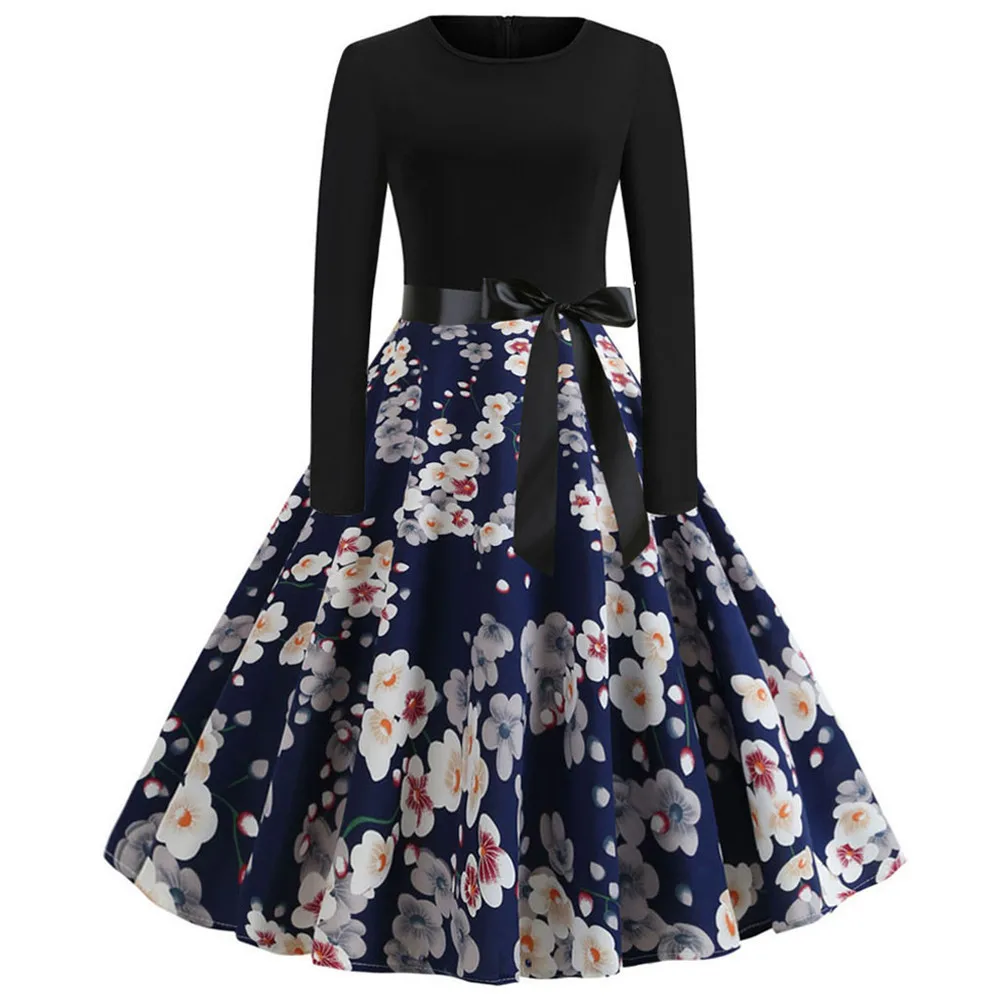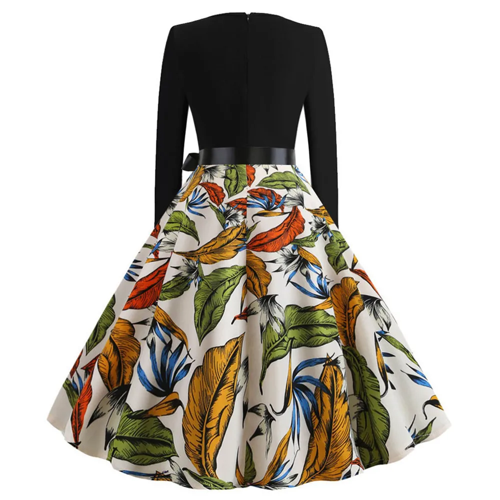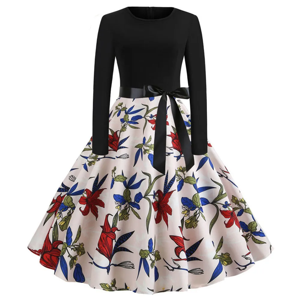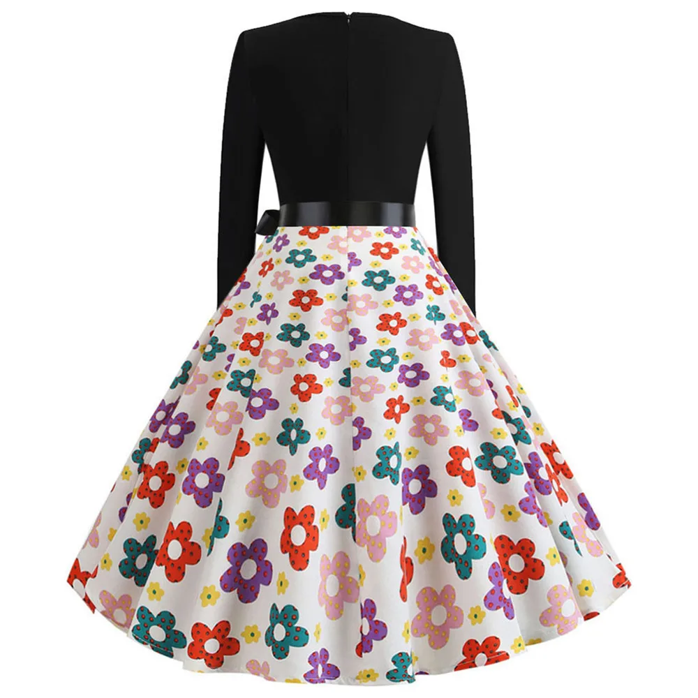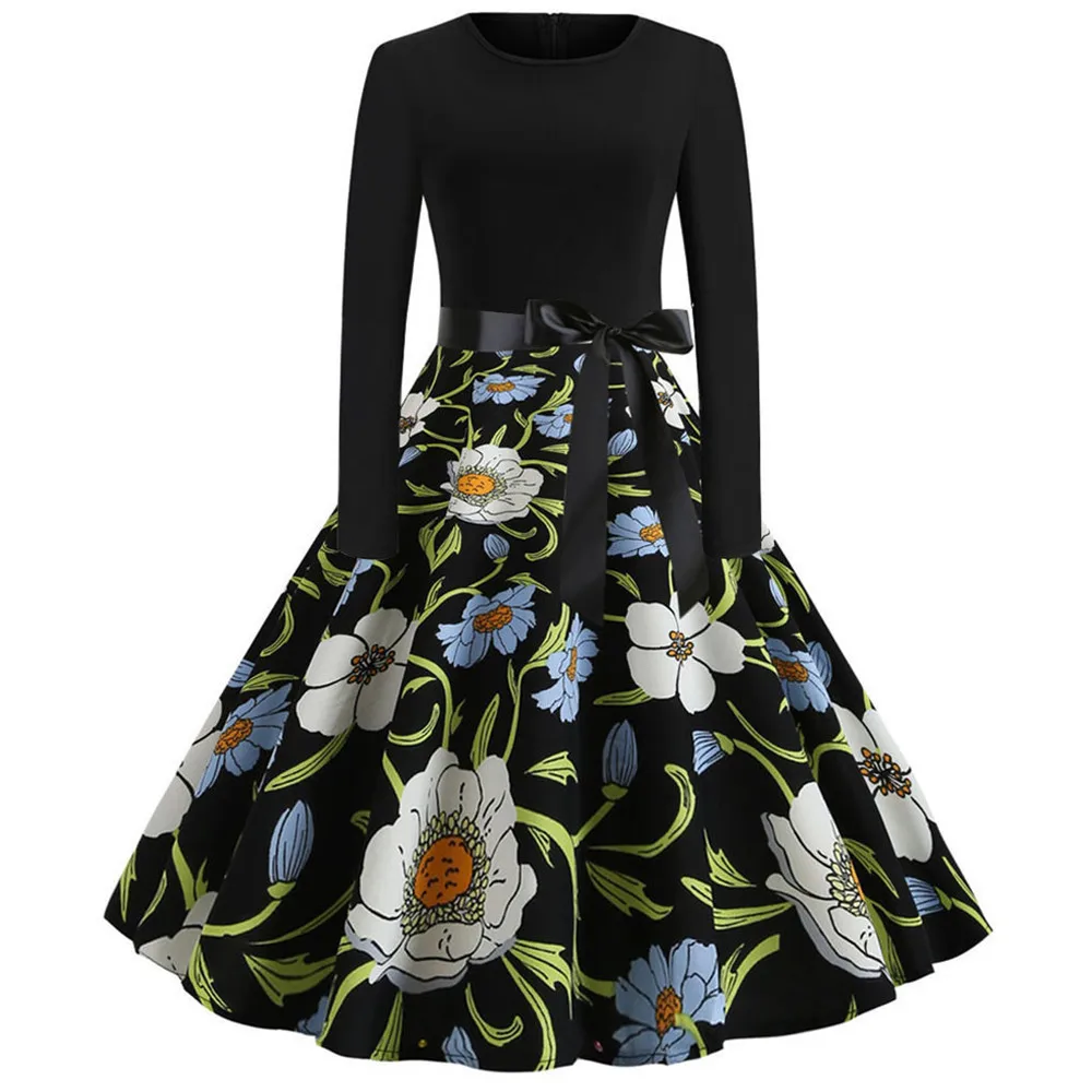 Женское винтажное платье, черное ТРАПЕЦИЕВИДНОЕ ПЛАТЬЕ с принтом, с длинным рукавом, круглым вырезом, в стиле рокабилли, на День святого Валентина, для вечерние, 2021