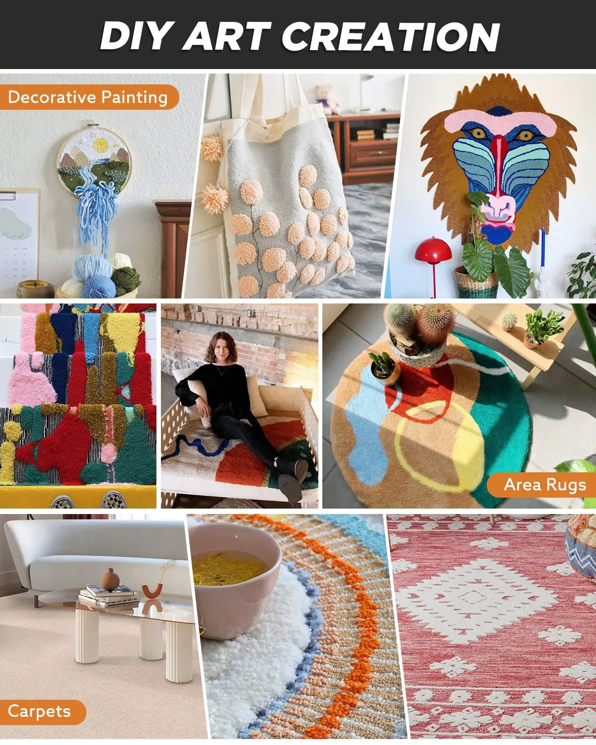 1. Мы можем использовать ружье 2 в 1 (обычно используется для изготовления ковров) для изготовления украшений, которые можно повесить на стену. Этот процесс включает в себя прохождение отдельных нитей через тканевые листы для формирования форм и дизайна. Иногда также изготавливаются ковры и другие украшения для демонстрации дома.