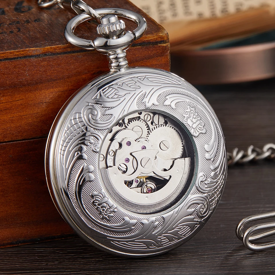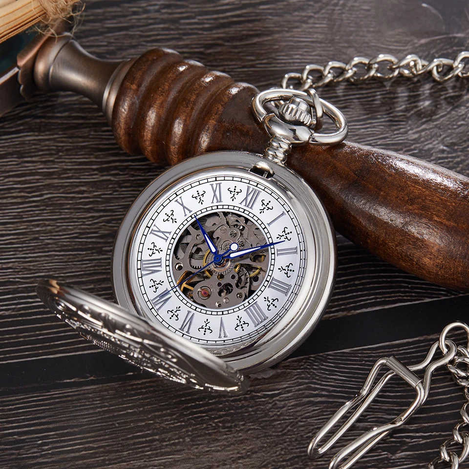 Часы карманные мужские механические с резьбой в виде поезда, бронзовые, с римскими цифрами, гравированный брелок, в подарочной коробке