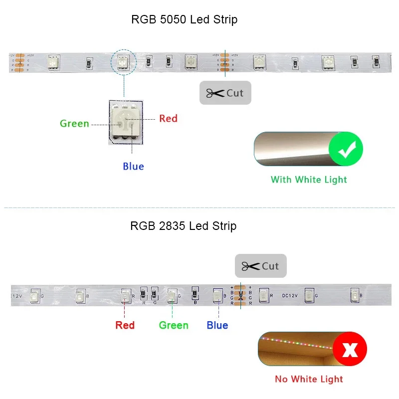1. 2835 RGB без белого, 5050 RGB имеет белый.