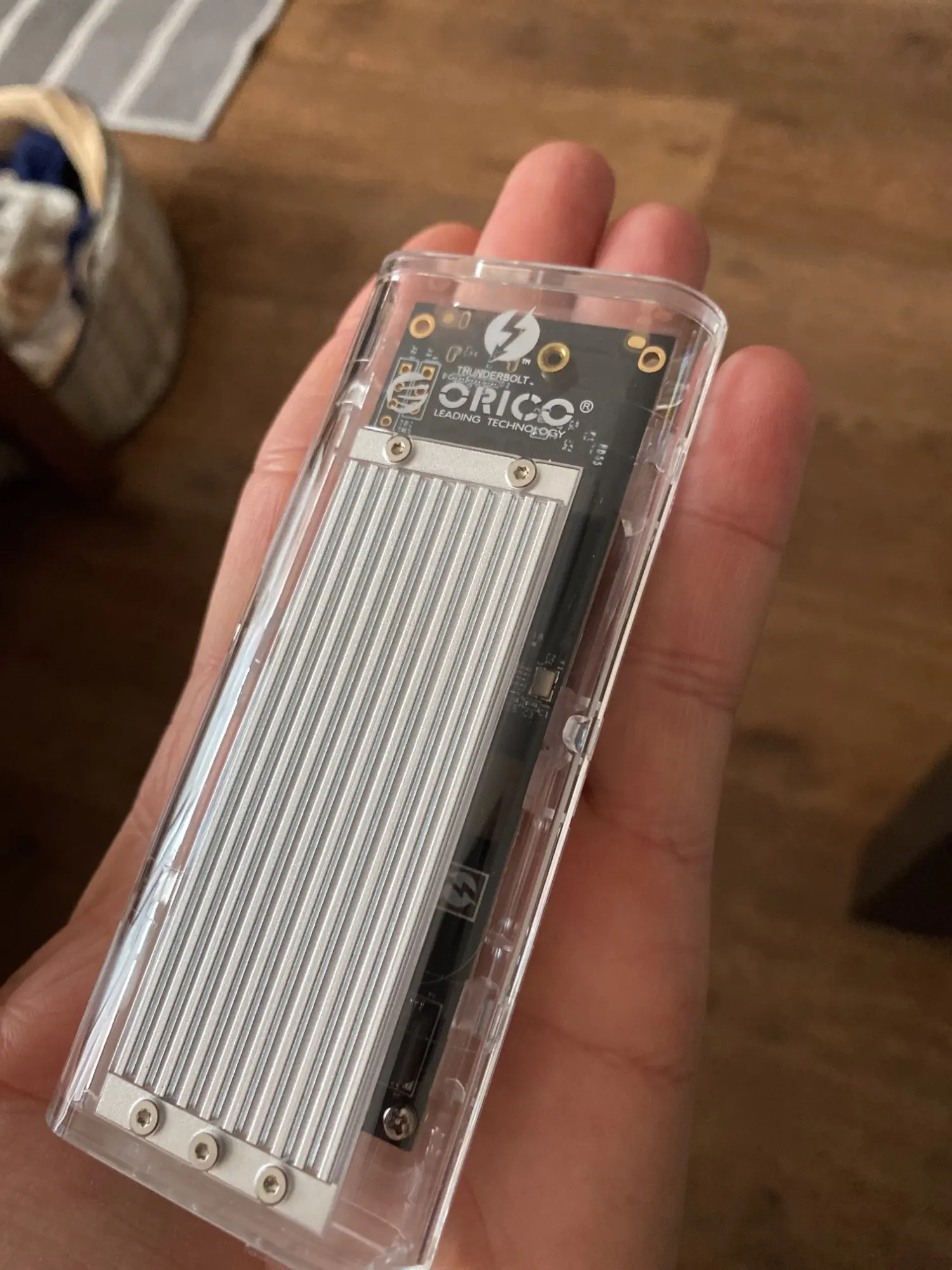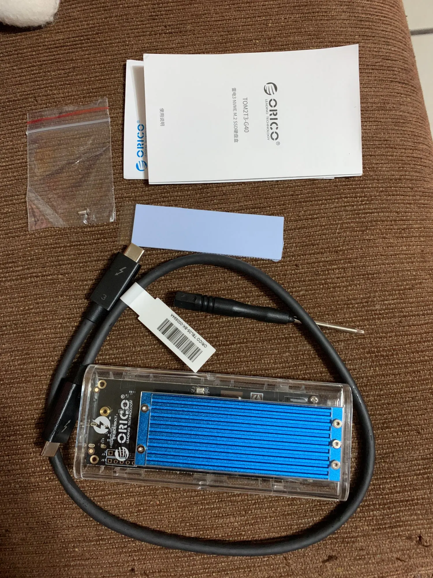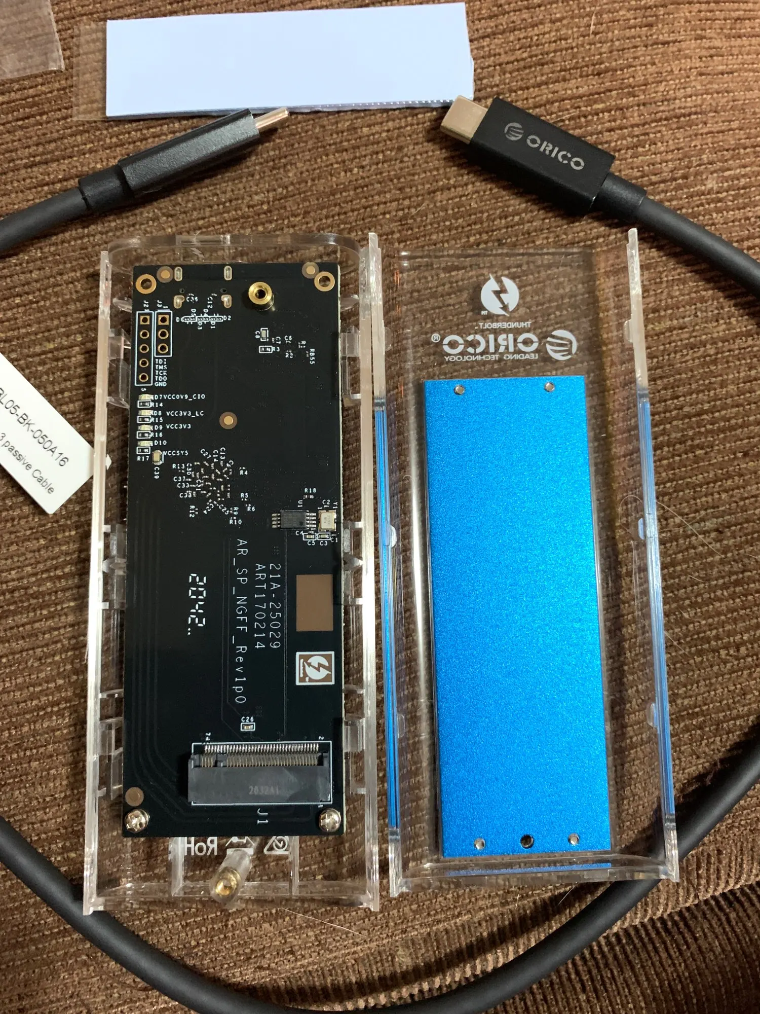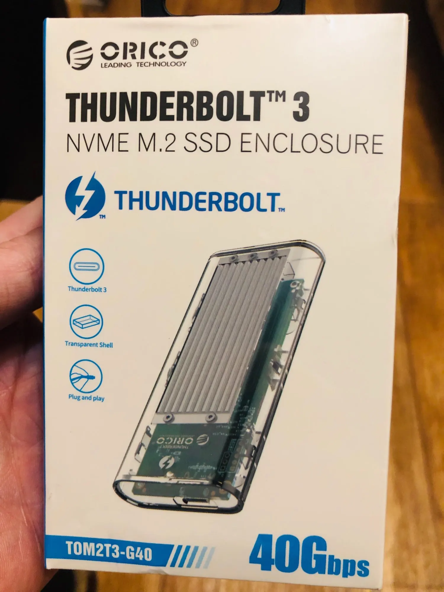 Плюсы: Самый дешевый Накопитель SSD Thunderbolt Cons: очень плохое качество записи за эти деньги Протестировано на Mac Mini с портом Thunderbolt с диском Adata XPG SX8200 Pro ТБ (см. Фотографии). Реальная производительность записи Adata составляет 2800 Мб/сек до заполнения кэша SLC и ~ 1200 Мб/сек после этого. Orico управлял только менее 440 Мб/сек, что является SATA-level, и далеко от РЕКЛАМИРУЕМОГО 4000 Мб/сек. Производительность чтения является посредственной на 2200 Мб/сек по сравнению с проверенными 3500 Мб/сек Adata. Таким образом, несмотря на то, что это самый дешевый внешний корпус NVMe Thunderbolt, на этих скоростях вам будет лучше получить 5 Гбит/с USB 3,2 Gen1 (ex-USB 3,1) корпус с SSD SATA для $20 США. Эта коробка Orico NVMe просто слишком дорогая для того, что она может сделать.