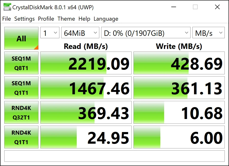 With combination WD SN550, speed goes 2000mb/s read and write. but, write goes down to 1000mb/s if continuously copying it's due to sn550's limit
