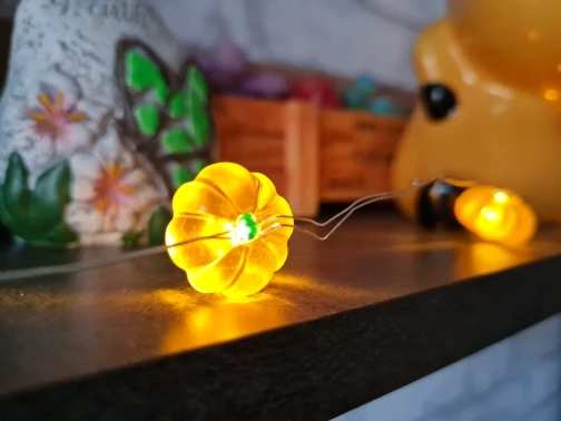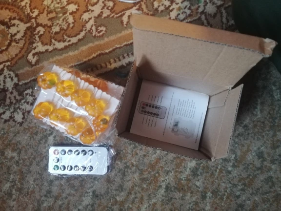 Как и ожидалось - тыковки без корешка, на её месте просто зелёная краска. Однако гирлянда хорошая, я заказала 4 штуки и хватает одного пульта, чтобы включить все (остальные три пульта будут лежать на запас). Продавцам надо убрать фотографии, где тыквы с корешками, а то получается ситуация из ряда: ожидание - реальность. Хотя я и ожидала тыквы старого образца благодаря комментариям. В любом случае спасибо!