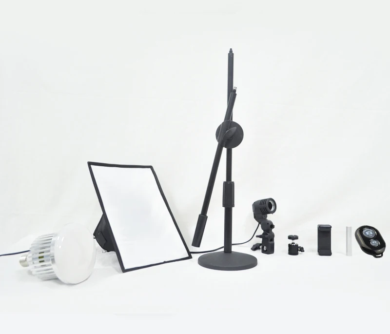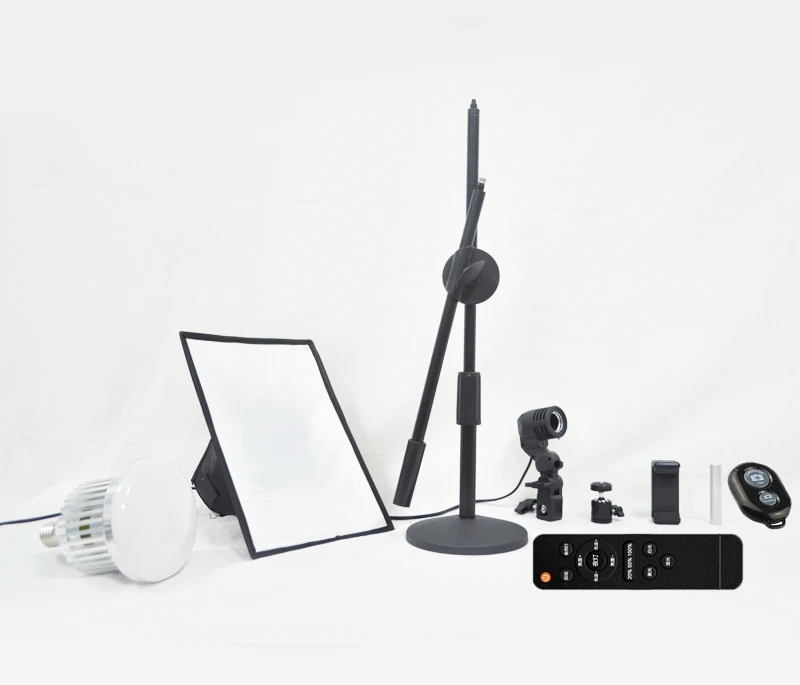 Комплект 5:Настольный кронштейн стойка с стрелой + шаровой головкой + зажим для телефона + серебряные аксессуары + держатель лампы + светодиодный светильник 35 Вт с пультом дистанционного управления + управление Bluetooth + 20*30 см Отражатель софтбокс