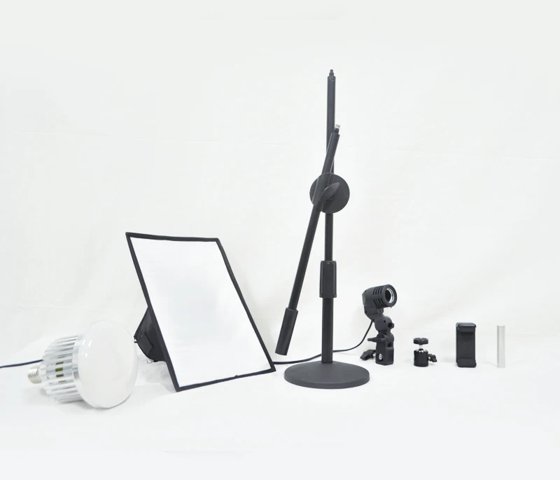 Комплект 4:Настольный кронштейн Подставка с стрелой + шаровой головкой + зажим для телефона + серебряные аксессуары + держатель лампы + светодиодный светильник 35 Вт + управление Bluetooth + 20*30 см Софтбокс с отражателем