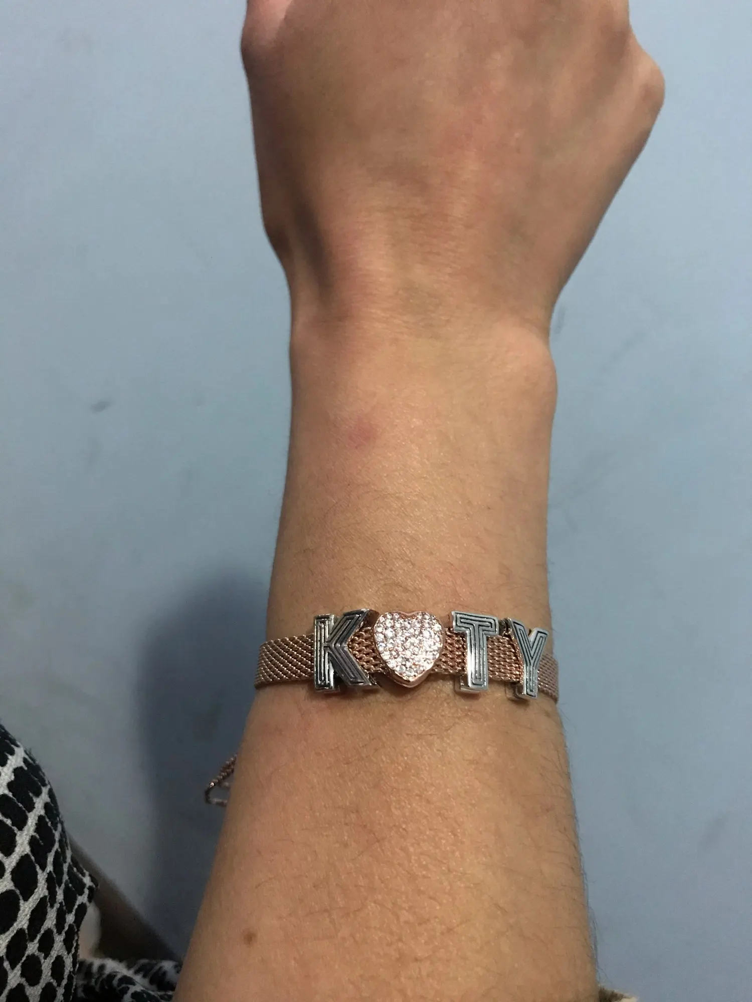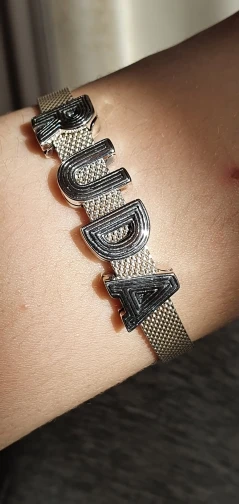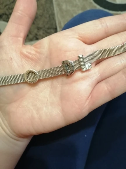 Слева оригинал, справа то что пришло от продавца. Качество хорошее, но не точная копия оригинала. Застежка хорошая, внутри каждой буквы силиконовые вставки которые не дают ей бесконтрольно ездить по браслету. В целом довольна покупкой.