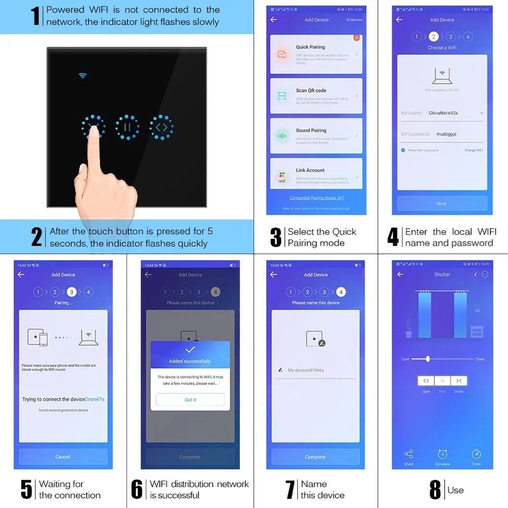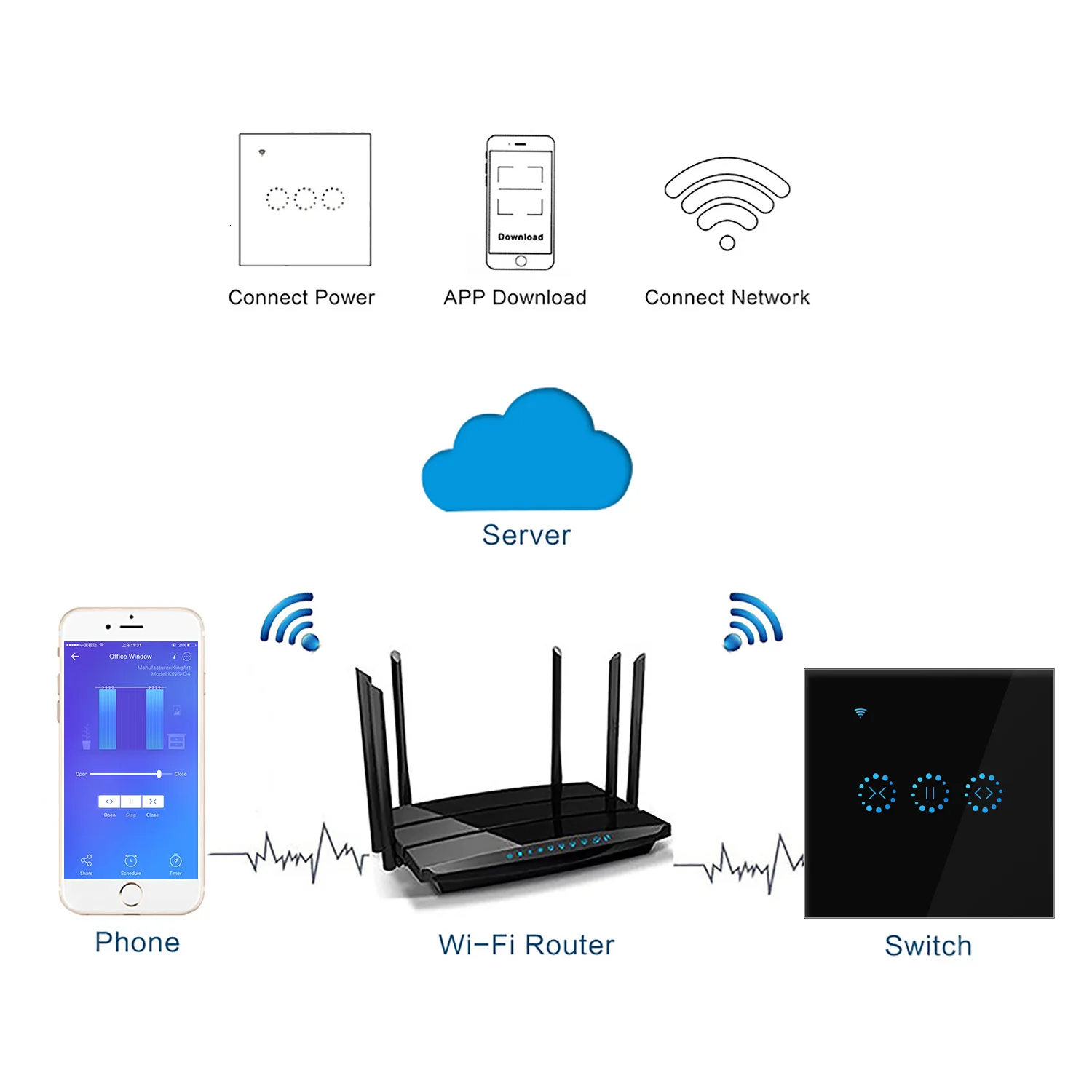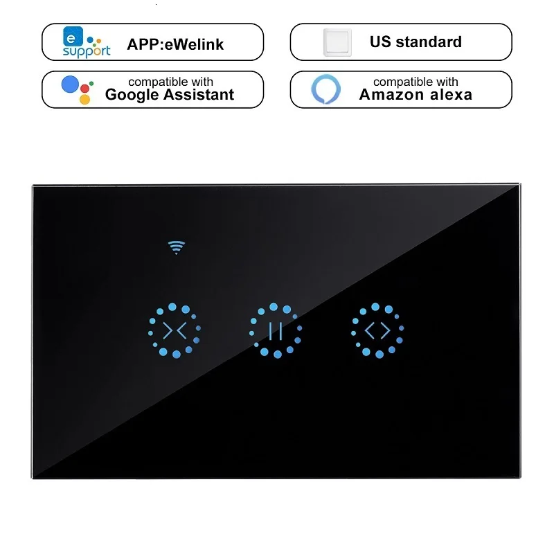 Умный дом WiFi электрические сенсорные жалюзи переключатель штор Ewelink приложение Голосовое управление Alexa Echo для механического ограничения жалюзи мотор Особенности: Работает для электрических жалюзи Переключатель занавески WiFi может работать с умными занавесками, электрическими дверями и другими приборами. Закрывая занавес через телефон или Голосовое управление Alexa Echo ночью и открывая его утром на теплой кровати. Или откройте умную дверь гаража на своем автомобиле, используя свой мобильный телефон, не нужно снимать автомобиль и нажимать переключатель, водить машину прямо в гараж. Безопасный сенсорный Управление переключатель Этот сенсорный выключатель поддерживает максимальную мощность 2200 Вт, которая может работать с большинством умных штор с функцией дистанционного управления. Огнестойкий материал алкилбензолсульфонат, безопасный для бытовой техники высокой мощности. Напряжение: 100-250 В переменного тока. Приложение пульт дистанционного управления Управление Используйте r можно использовать смартфон, чтобы удаленно открывать/закрывать занавес или электрическую дверь в любое время и в любом месте с помощью приложения до тех пор, пока телефон iOS/Android имеет сеть 3G/4G/WIFI, наслаждайтесь удобством умной жизни! Приложение: eWeLink. Совместимость с Alexa / Google Home Пользователь может управлять этим переключателем занавес двигателя через голос через Alexa / Google устройство Для включения/выключения занавеса. Простота в эксплуатации, умная жизнь! Сроки Поддержка Макс 8 включить один/повтор/Обратный отсчет времени графики каждого устройства. Заданные таймеры могут работать даже в сети недоступны, но устройство должно поддерживать питание. Примечание: Отсканируйте qr-код на карточке qr-кода, чтобы загрузить приложение и прочитать руководство пользователя. Этот сенсорный Wi-Fi переключатель должен подключаться к aНейтральныйЛиния.