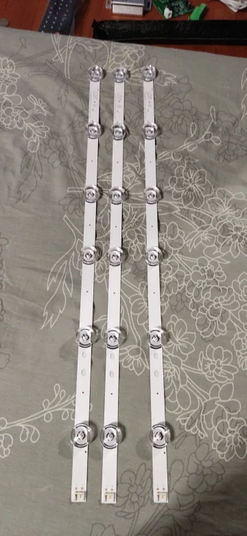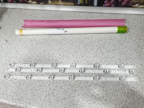 Три планки светодиодов прибыли в краснодарский край за несколько дней-очень быстро. на обратной стороне планок на алюминиевой основе уже есть скотч. Планки универсальные АВ, были А и В. Разъем снимается вверх а не в бок. Светит ровно. Good. Cтавил в LG32LB561U.