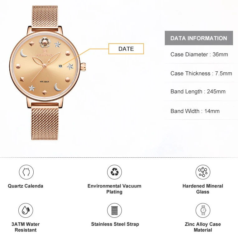 Артикул:NAVIFORCE роскошные женские часы из розового золота