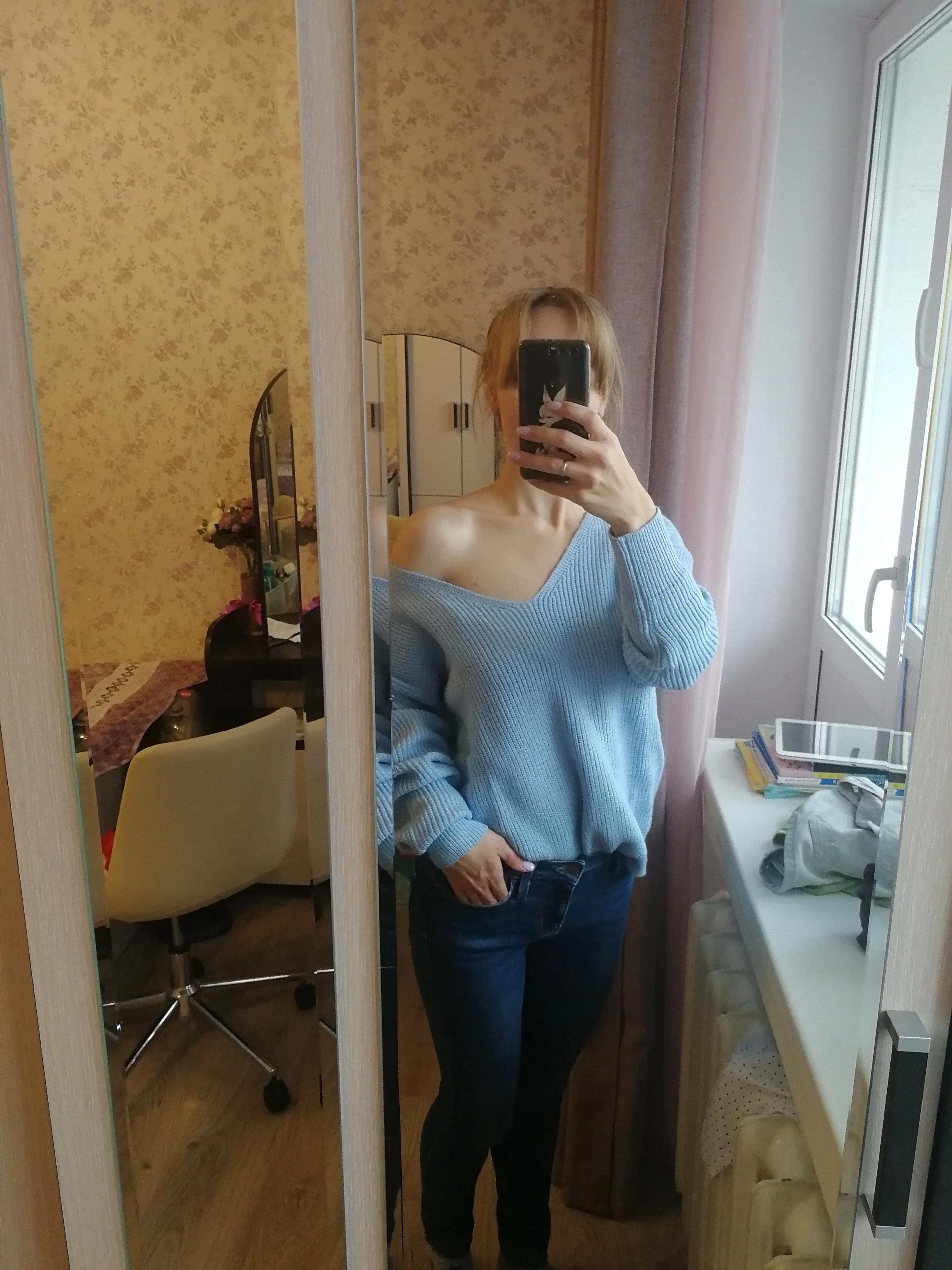 Посылка пришла за три недели, была объединена с другими моими покупками. Свитер отлично подошёл на мой 46 размер, сидит свободно, постороннего запаха нет, но ощущение после открытия было, что немного влажный, поэтому не фотографировалась в нем