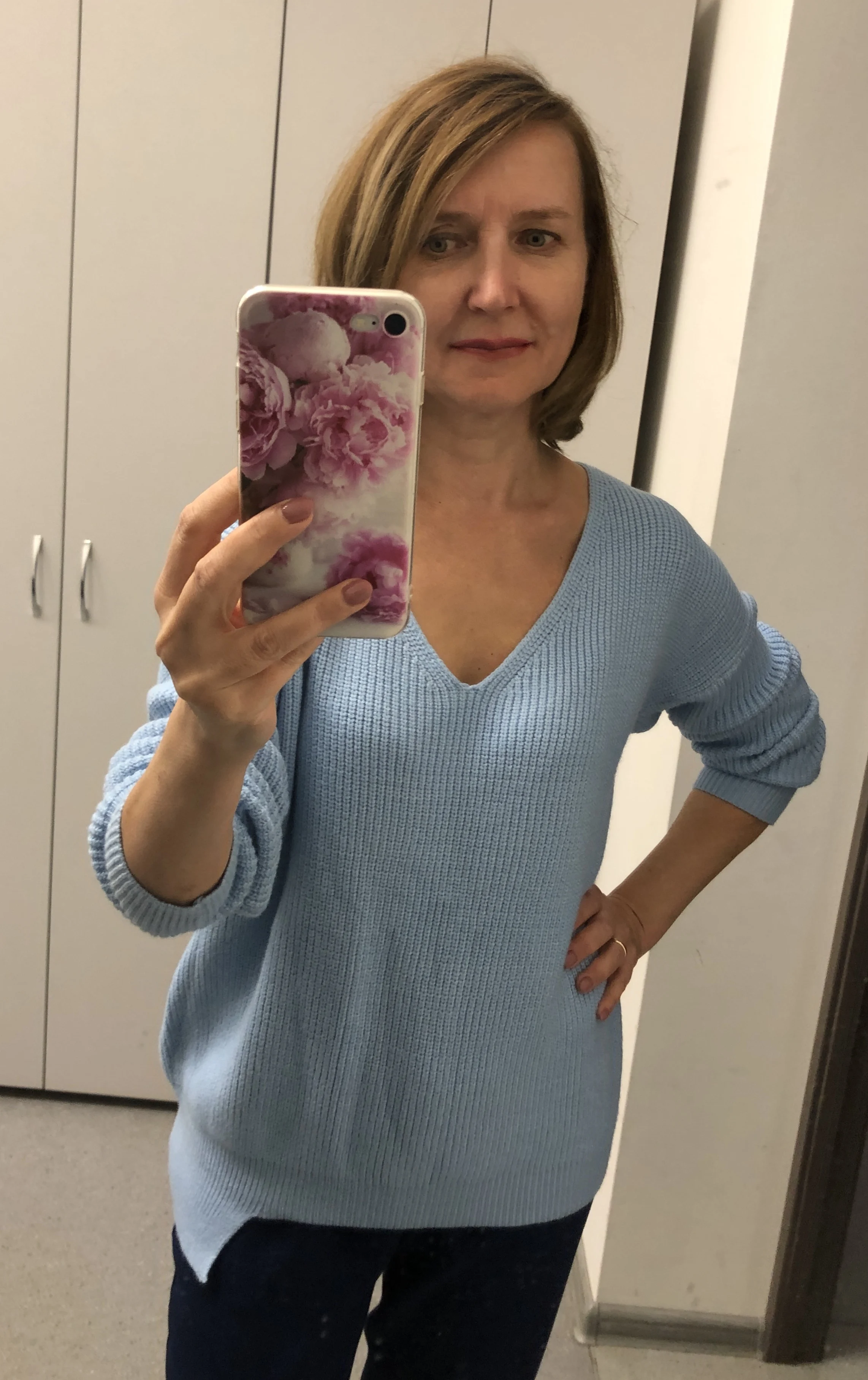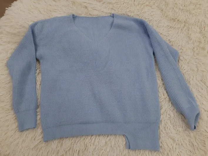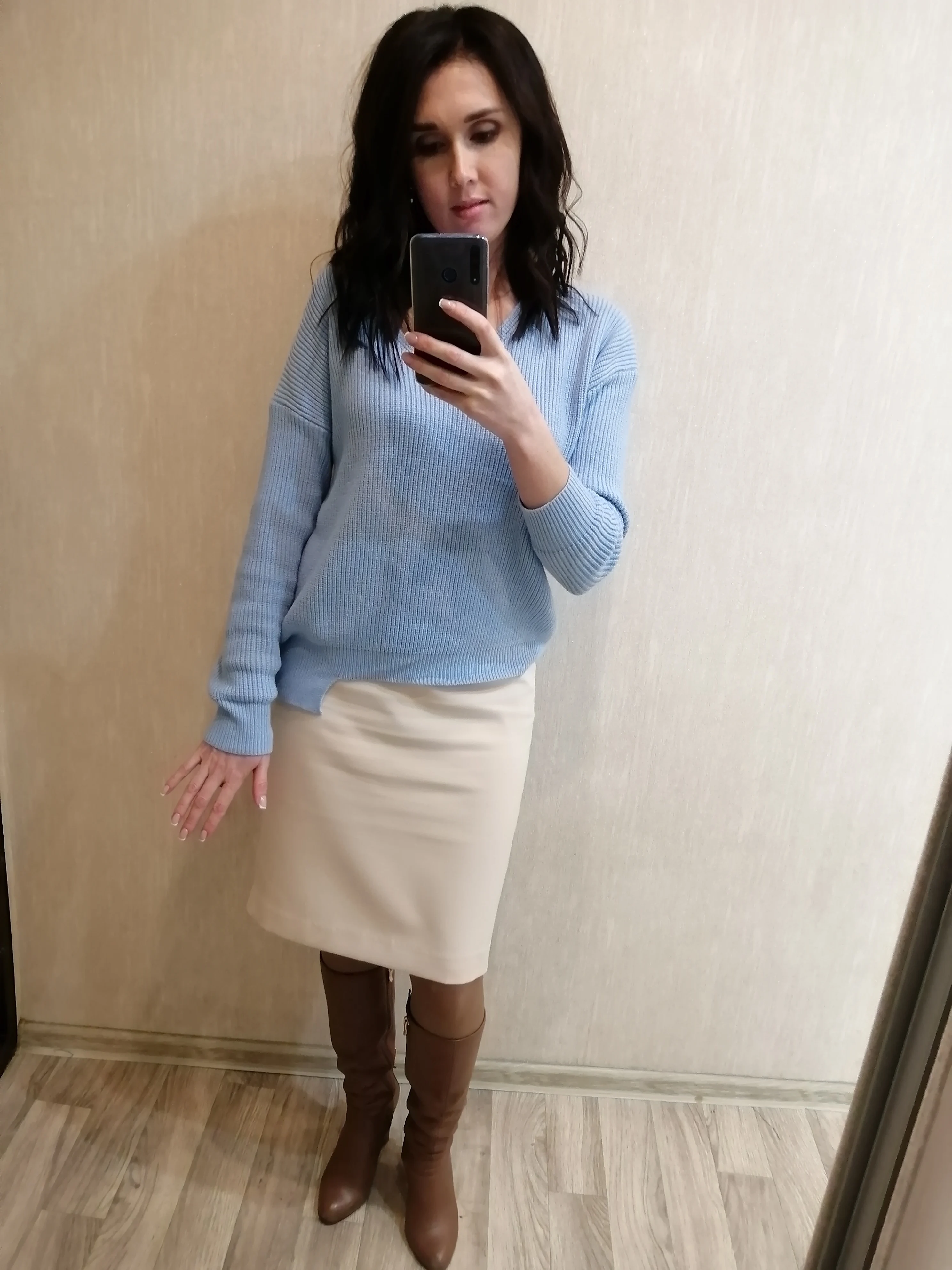 Очень красивый свитерок,размер отлично подошёл,цвет нежно голубой.