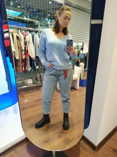 Отличный джемпер! Мягкий,шелковистый какой-то на ощупь! Качество прекрасное! Думаю,что стирать надо либо руками,либо в стиральной машине в режиме деликатной стирки ,но в мешочке! Цвет - настоящий голубой,не блеклый! Брали дочке. Она в восторге! Свитер прекрасно можно заправлять,как сейчас это носят,в штаны! Он не толстый и не тонкий! Вязка отличная,швы тоже! Запаха никакого нет! Наверное,закажем в другом цвете ещё! Продавец оперативный! Рекомендую! Заказывайте смело! На рост 167 см - до середины бедра,может и немного ниже. На размер M - оверсайз,но в разумных пределах!