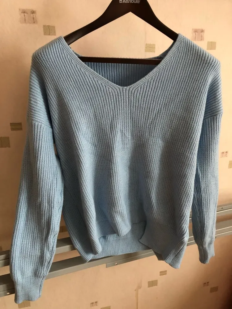 Замечательный свитер. Полностью совпадает с фото продавца. Цвет голубой очень нежный. вязка аккуратная, машинная. С продавцом не общалась.