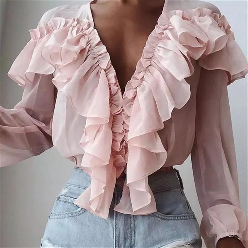 Женская блузка с оборками, шифоновые рубашки с рюшами, одноцветная ...
