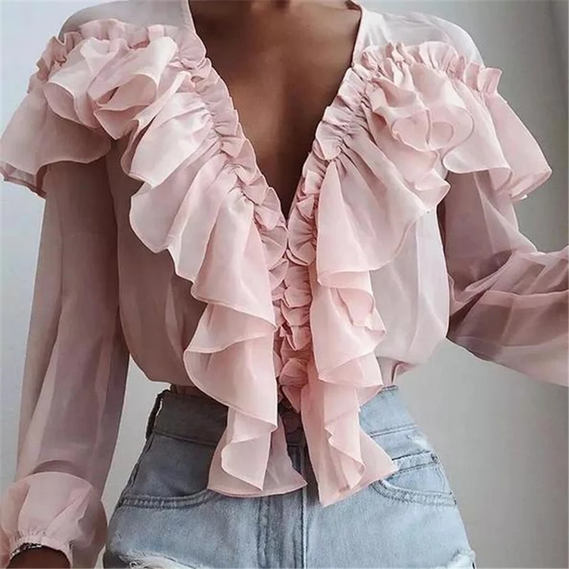 Женские винтажные топы с оборками, пикантные стильные блузки с V-об...