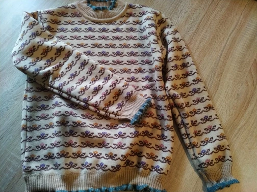 Ужасный свитер. Сплошная синтетика, свитер как будто из пластика. Очень сильно маломерит. Заказывала на два размере больше, пришёл всё равно очень маленький. Не рекомендую.