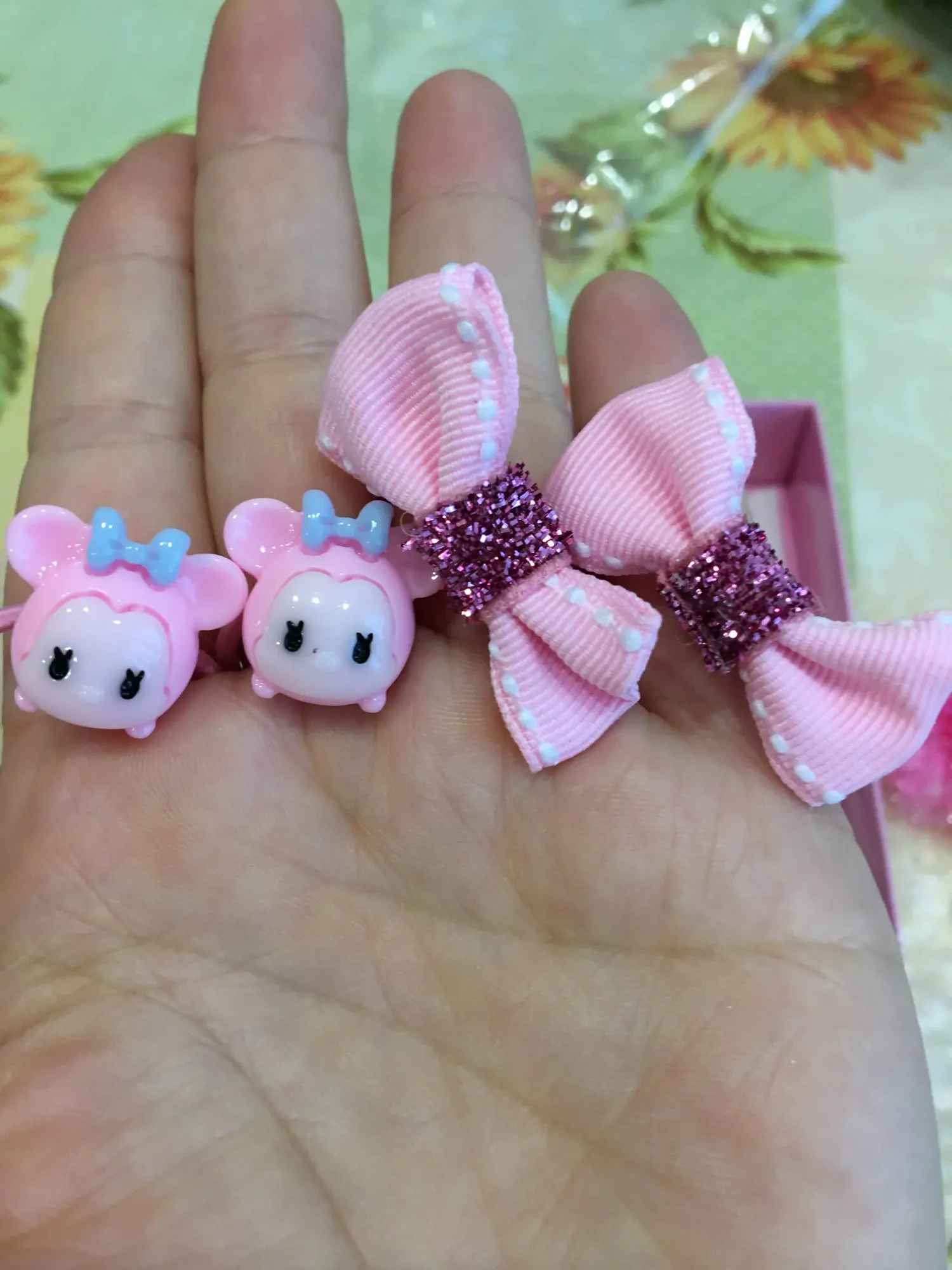 заколочки хорошие,ничего не отклеено,все целое,резиночки как раз для тоненьких волосиков у деток,мне нравится...рекомендую