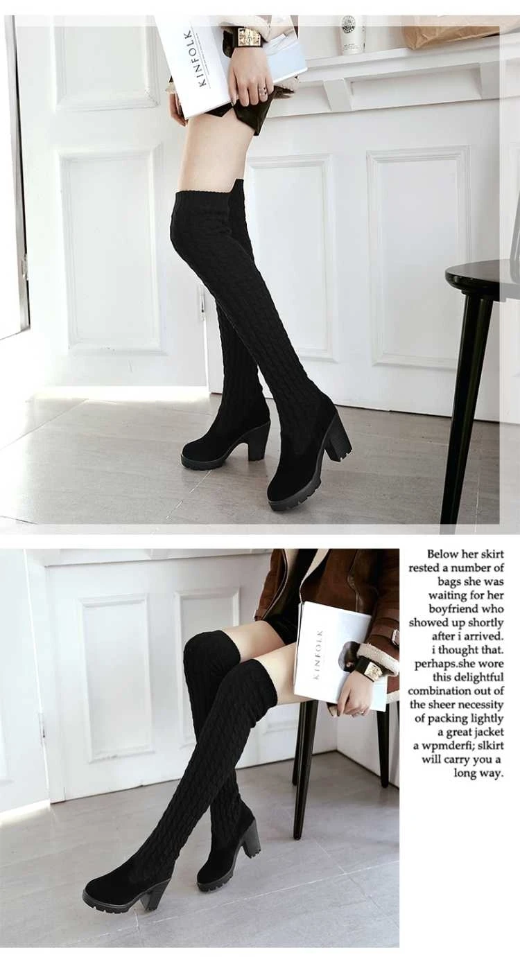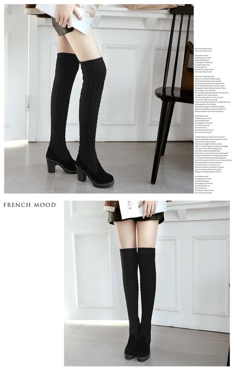 Тянущихся тканей ботфорты выше колена новые вязанная шерстяная обув...