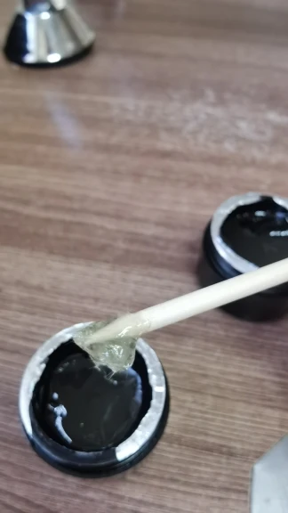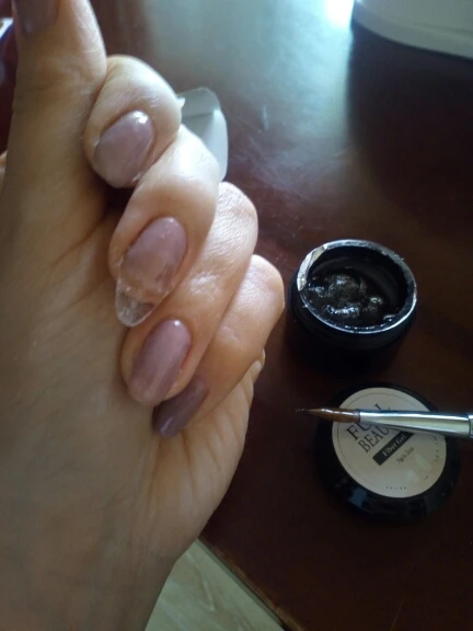 На фото указано, что материал густой с ворсинками, на самом деле жижа и мало ворсинок, при перемешивании ситуация не поменялась. Взять каплю и точечно произвести ремонт не получится, придётся мазать тонюсеньким слоем по ногтевой пластине. Если только нанести полигель, а поверх помазать жижкой с ворсинками. Смысла не вижу в этом материале, да и лишняя трата времени на работу с ним.