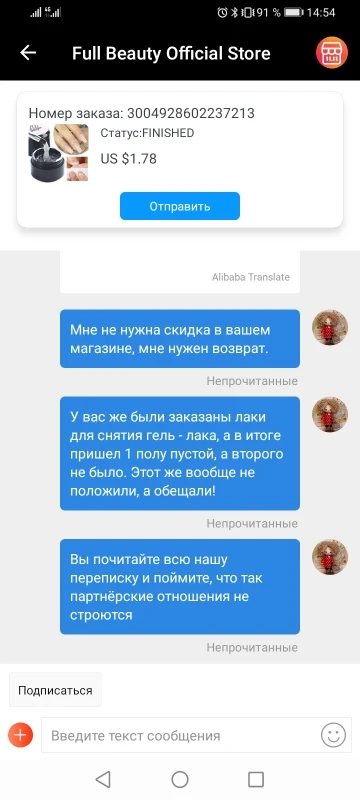 Уж извините,продавец,но напишу правду. Ставлю 1 звезду,а была бы возможность,то - 5 поставила!Заказала 2 лака и средство для наращивания.Пришёл 1 лак и тот полупустой.Вроде поговорили,обещали выслать остальное. Тишина.Открываю спор, мне говорят,чтоб закрыла его.Да с какого праздника?!Прежде чем заказывать тут что-то очень рекомендую обдумать покупку,тк продавец ведёт себя крайне не красиво,обманывает и кормит "завтраками",которых не будет. Не рекомендую этот магазин.