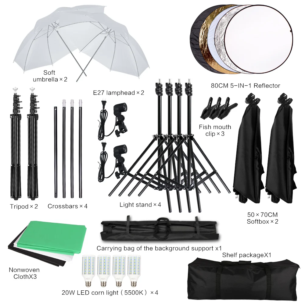 2x33 "белый мягкий светильник зонтик2x50x70 см одноламповый держатель для софтбокса2 x держатель для одной лампы (штепсельная Вилка европейского стандарта/штепсельная вилка стандарта США/штепсельная вилка стандарта Великобритании/штепсельная вилка стандарта Австралии)4x20W светодиодный светильник1x2,6x3m фон стендСветильник 4x2 мОтражатель 5 в 1x80 см3x1,6x3 м Фотофон из флизелинового материала (зеленый, белый, черный)3 x пружинный зажим для рыбы1 x чехол для фона1 x сумка для переноски из ткани Оксфорд