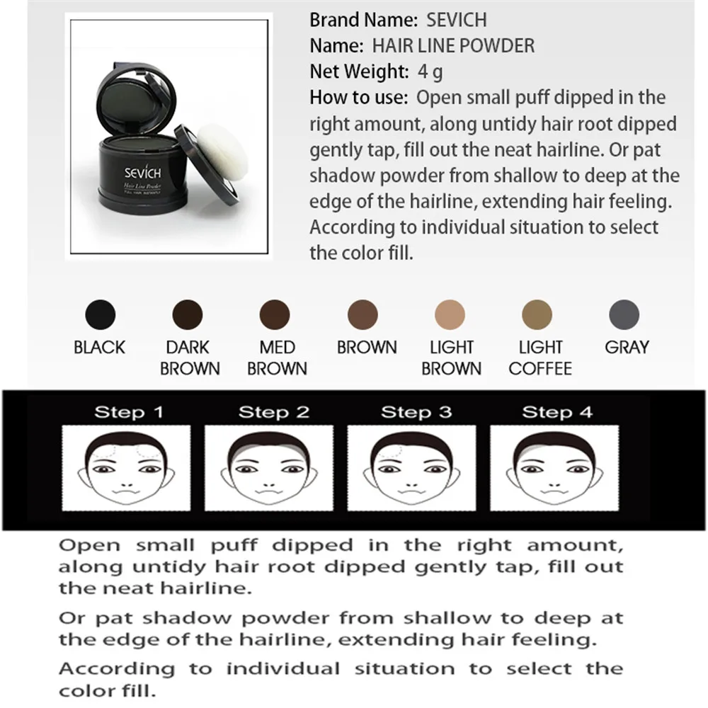 Цвет для заказа цвета: черный/темно-коричневый/Средний коричневый/светильник Кофе/серый Тип: тени для волос Вес нетто: 4 г Мгновенный временный цвет волос на светильник, темно-или серые корни Легкое применение-применяется менее чем за минуту Не повредит волосы Наполняет и утончает волосы Посылка включает: Порошок для волос 1 шт. + буфет 1 шт. Он используется для наполнения волосяного покрова, наполнения вашей прически и покрытия ваших белых волос. 7 разных цветов подходят для разных людей с разным цветом волос. Он наполнит вашу линию волос естественным образом и долговечным. Все наши тени для волос не вредят вашим волосам. Выберите цвет, подходящий для ваших волос Мы считаем, что вам очень понравится Это полезно для всех людей, особенно для тех, у кого проблемы с высокой линией волос.