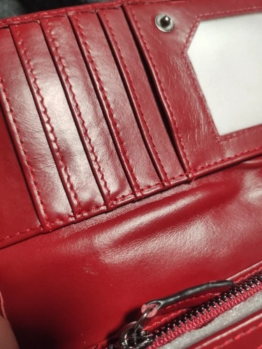 заказала 24.01, пришло 08.02. упаковано хорошо. кожа по виду похожа на натуральную, мягкая, приятная, запах тоже песня.. но есть несколько НО - повреждения. на ярко красном они не сразу бросаются в глаза, но можно увидеть. скорее всего от клея или при приклеивании появились данные следы . замки , как и многие металлические немного с заданием открывается, нужно приноровиться. заказала подобный кошелек в другом магазине - полное Г...но... облезли углы через месяц щядящей эксплуатации. этот хоть как-то похож на кожаный... ну да узнаем через некоторое время, облезет или нет (только я сомневаюсь, что облезет) за косяки больше 4 звёзд рука не поднимается поставить. гравировка просматривается хорошо. сделали то, что и хотела. брали в подарок