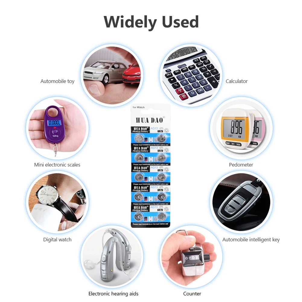 Использование: лазерные указки, часы, часы, калькуляторы, компьютеры, камеры, цифровые камеры, КПК, пульты дистанционного управления, видеокамеры, электронные игры, электронные инструменты, MP3-плееры, цифровые диктофоны, игрушки, глюкоза в крови, измеритель уровня холестерина, сотни других электронных продуктов