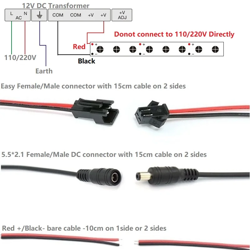 Разъем постоянного тока оснащен адаптером (5,5*2,5 мм или 2,1 мм) постоянного тока, его можно последовательно подключатьПростой соединитель подходит только для той же модели легкого соединителя, также может быть подключен последовательно