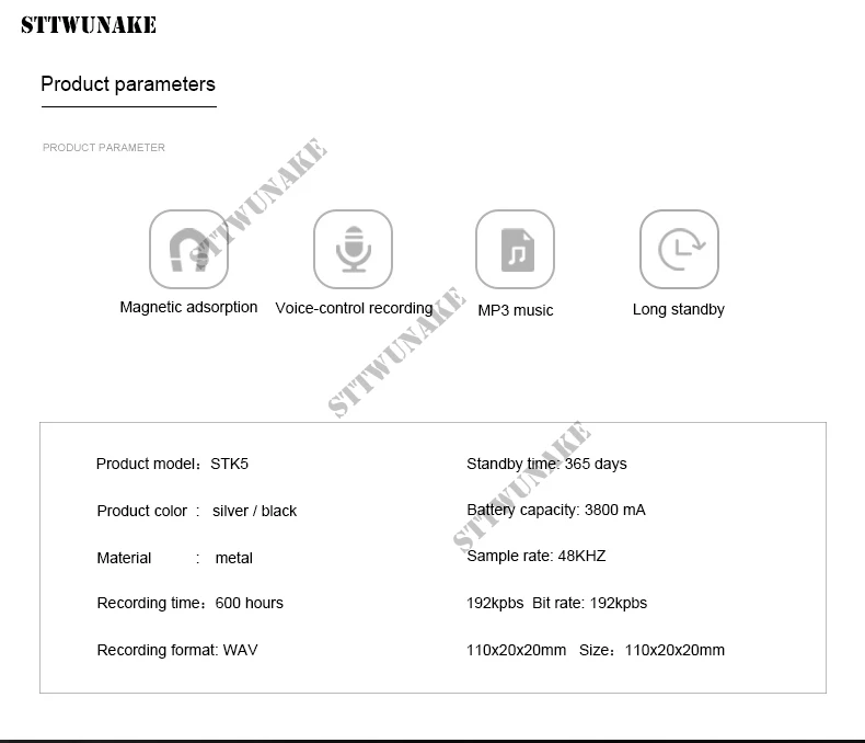 Магнитная Адсорбция Запись голосового управления MP3 музыка Долгий режим ожидания Модель продукта: STK5 Цвет изделия: серебристый/черный Материал: металл Время записи: 600 часов Формат записи: WAV Время работы в режиме ожидания: 365 дней Емкость аккумулятора: 3800 ма Частота образцов: 48 кГц Битрейт: 192kpbs Размер: 110х20х20мм