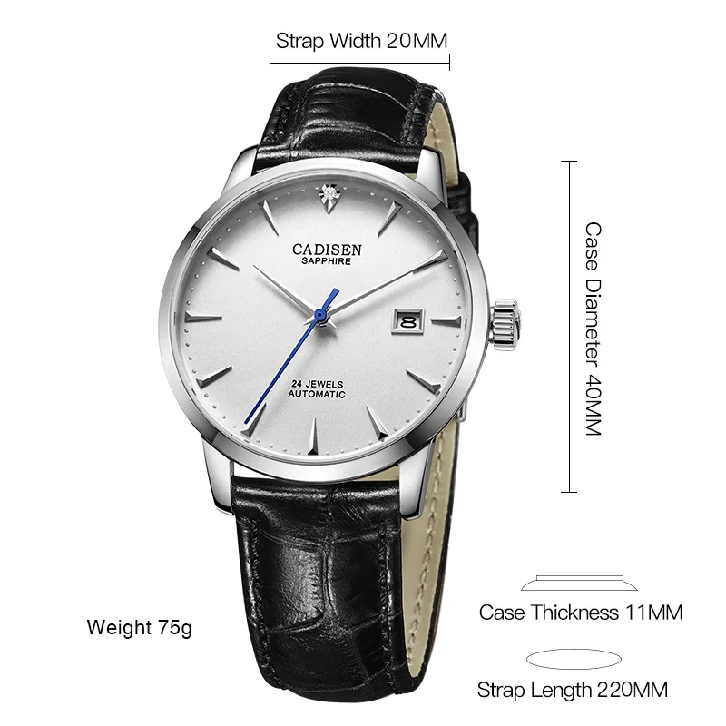 Описание продукта: -Южная Африка настоящий Алмаз инкрустация на часах. -CITIZEN MIYOTA 9015 автоматическое механическое движение. -Корпус из нержавеющей стали 316L -Высококачественный ремешок для часов из натуральной кожи. -Водонепроницаемость на глубине до 50 м. -Гарантия 12 месяцев Характеристики (прибл.): -Диаметр корпуса часов: около 4,0 см -Толщина корпуса часов: около 1,1 см -Длина ремешка (включая чехол): около 22,0 см -Ширина ремешка: Около 2,0 см Посылка включает в себя: -Новые часы CADSIEN -Одна коробка. -Руководство по эксплуатации, гарантийный талон. -Одна ткань для чистки часов