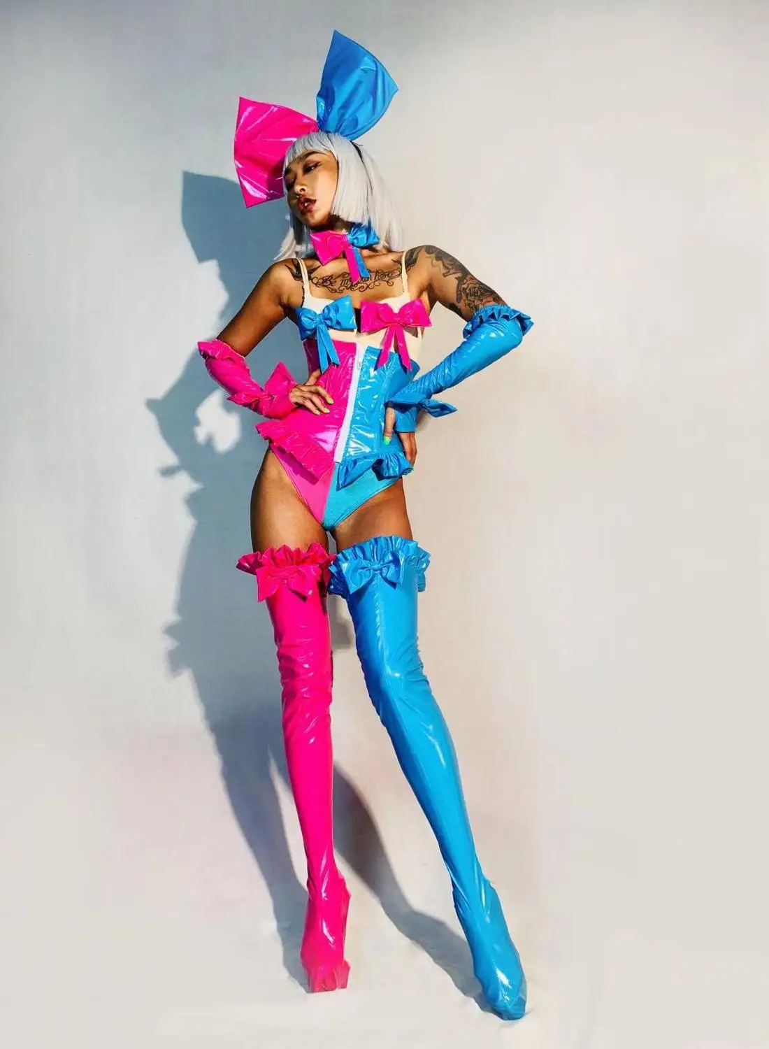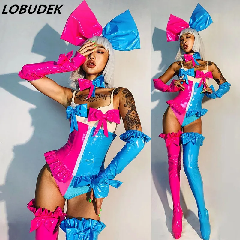 Женский сексуальный костюм для косплея, розовый, синий комбинезон, леггинсы, перчатки, головной убор, Одежда для танцев, команд, шоу, сцены