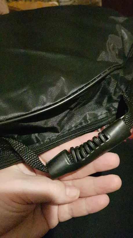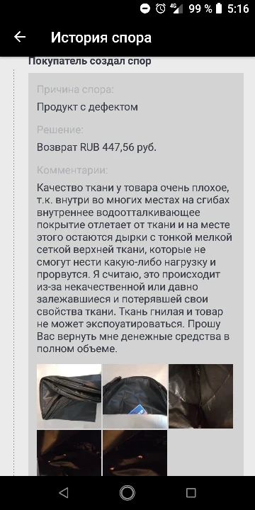 Пришёл товар очень быстро, упакован был хорошо, упаковка не повреждена, пошито изделие хорошо, но качество ткани очень плохое, т.к. внутри во многих местах на сгибах внутреннее водоотталкивающее покрытие отлетает от ткани и на месте этого остаются дырки с тонкой мелкой сеткой верхней ткани, которые не смогут нести какую-либо нагрузку и прорвутся. Я считаю, это происходит из-за некачественной или давно залежавшиеся, гнилой и потерявшей свои свойства ткани. Продавец долго со мной общался, просил, чтобы я согласился на возврат части денег, но так ничего и не вернул. АлиЭкспресс по открытому мною спору приняли решение вернуть мне все денежные средства, но прошла уже неделя и деньги мне пока не вернули.