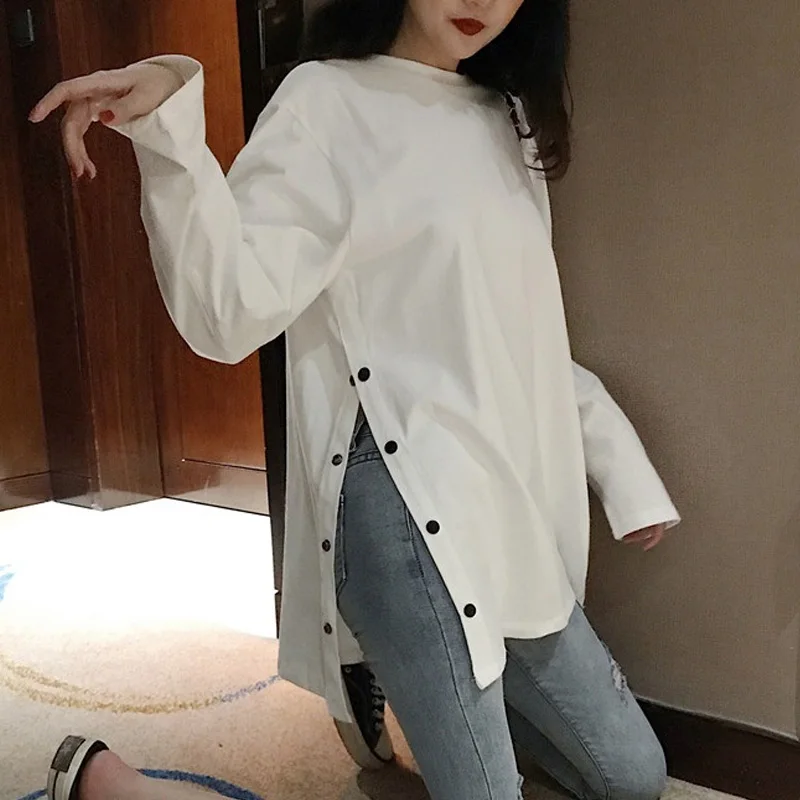 Женская длинная футболка, белая, черная Однотонная футболка большого размера с разрезом на боковых пуговицах, с круглым вырезом, в стиле Харадзюку, весна 2021