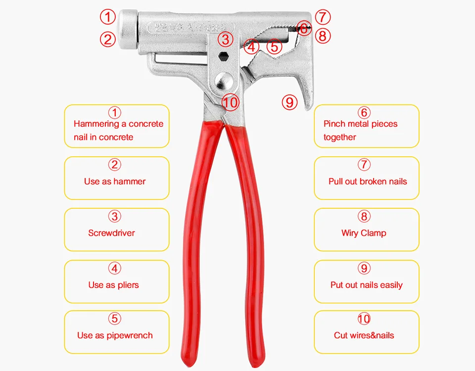 Functionpower nail gun, pipe plier, live wrench, screwdriver