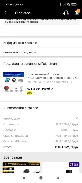 Наконец-то заказ получен.Машика жужит, подсветка горит, включается-выключается нормально.Комплект- как заявлено в описании.Вобщем и целом вопросов по качеству нет, ибо знал что беру.Но.... Заказывал с Российского склада 11.09, с типо Экспресс-доставкой.По объявленным срокам доставить должны были 18.09 , но заказ как завис на стадии Отгружено так и висел до 28.09 без движения.По присвоенному треку в 5Post выдавалась инфа Ваш заказ неотгружен.Продавец все мои запросы - С с заказом - игнорировал, уж не знаю мне так повезло и они со всеми так. Хотел уже спор открывать, но машинка реально нужна ибо ремонт в разгаре, но решил подождать И вот сегодня 01.10 получил посылочку.