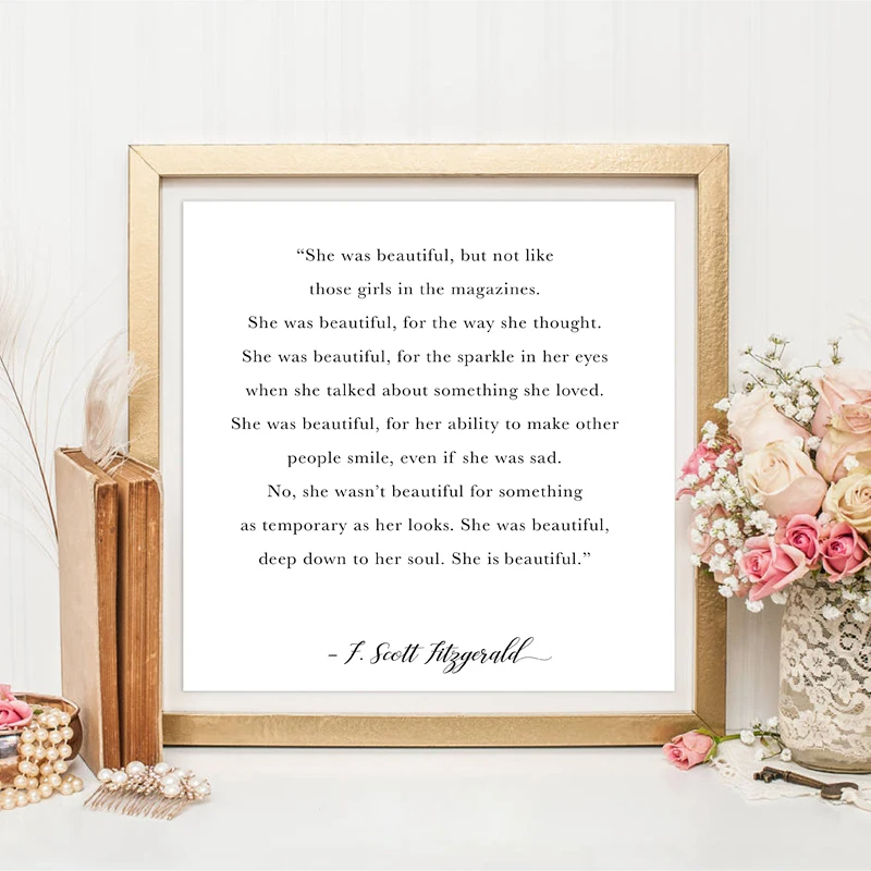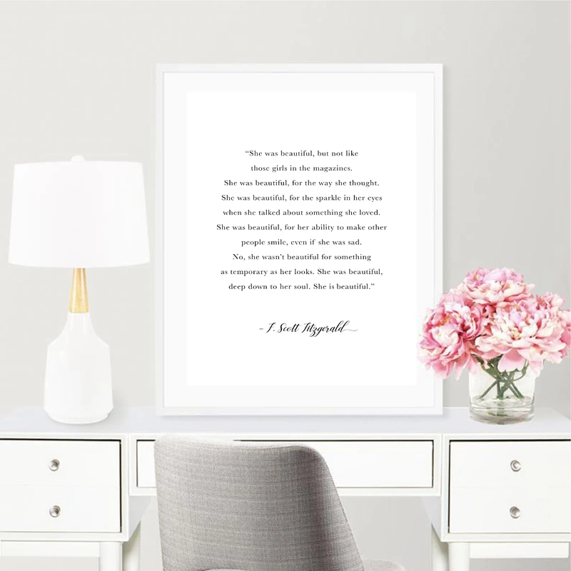 Е. Картина для декора комнаты девушки, Скотт Фицджеральд с принтом с цитатой, она была прекрасной, подарок для нее, Мотивационная стена, художественный постер картина