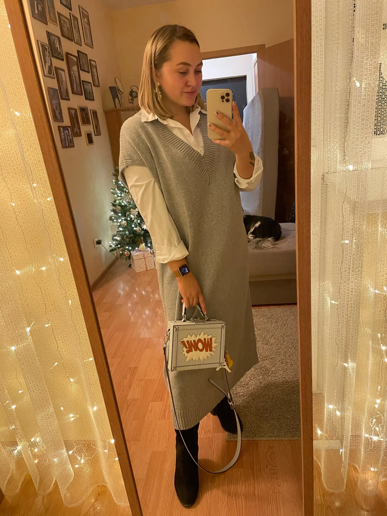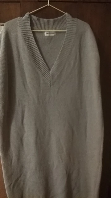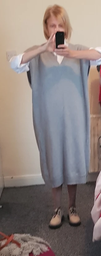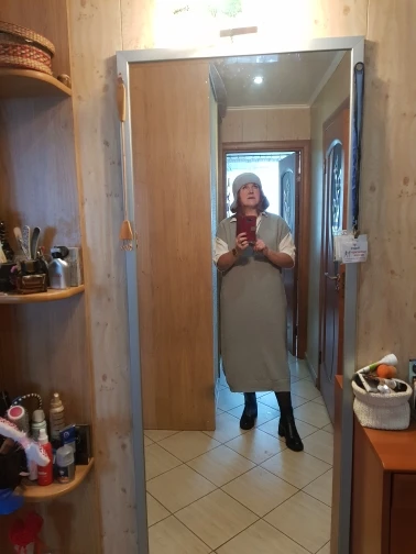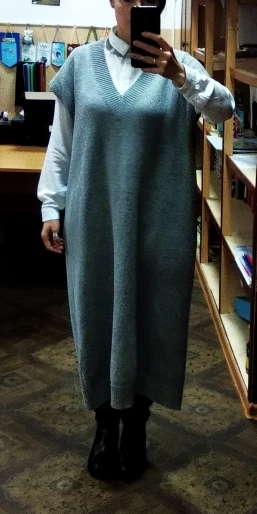 Громадный оверсайз, всем оверсайзам оверсайз. Как промеряла пришла в шок, пару дней расстраивалась, потом отпарила и одела с рубашкой. Ситуация исправилась, носить буду. Само платье плотное, достаточно тяжёлое. Состав написан 35 шерсть, 65 акрил. К качеству в принципе нет вопросов, скатываться если и будет, то не скоро