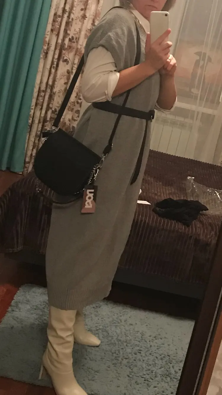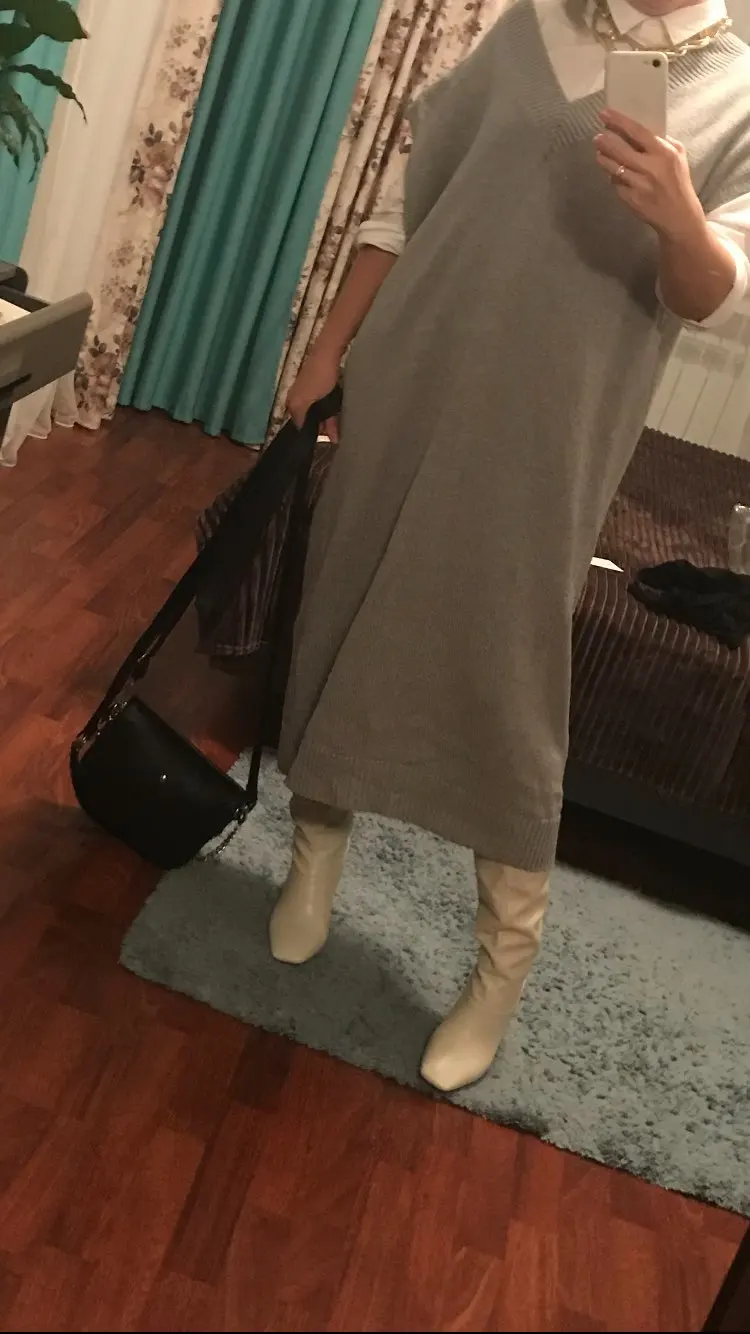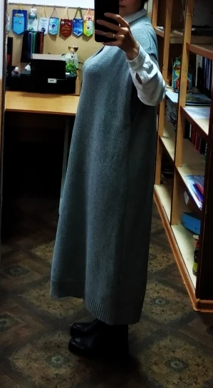 Товар отличный, но на модели образец более тонкой вязки, в реале свитер плотнее, петки крупнее. Цвет серый, на модели он почти белый. Не колется, если к телу. При росте 165 чуть ниже середины икры. ОБ 128 сел отлично, не свободно и не в обтяжку. Можно носить с блузкой, можно на длинное платье, а так же лосины или Капри. И тд. Главное, что бы не сел после стирки. С продавцом не общалась.
