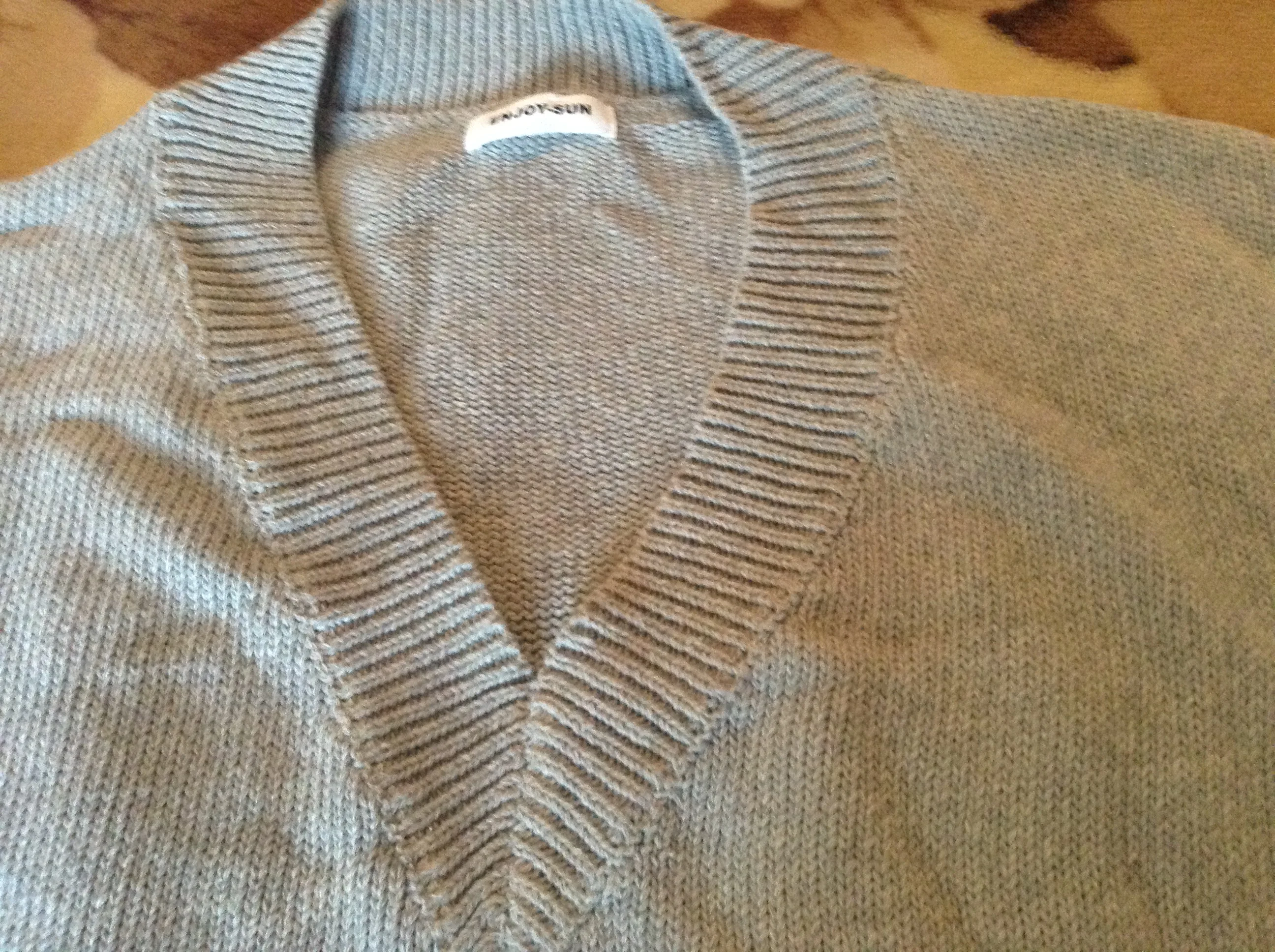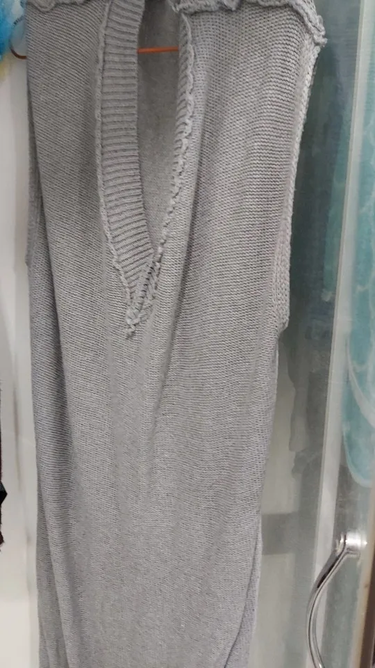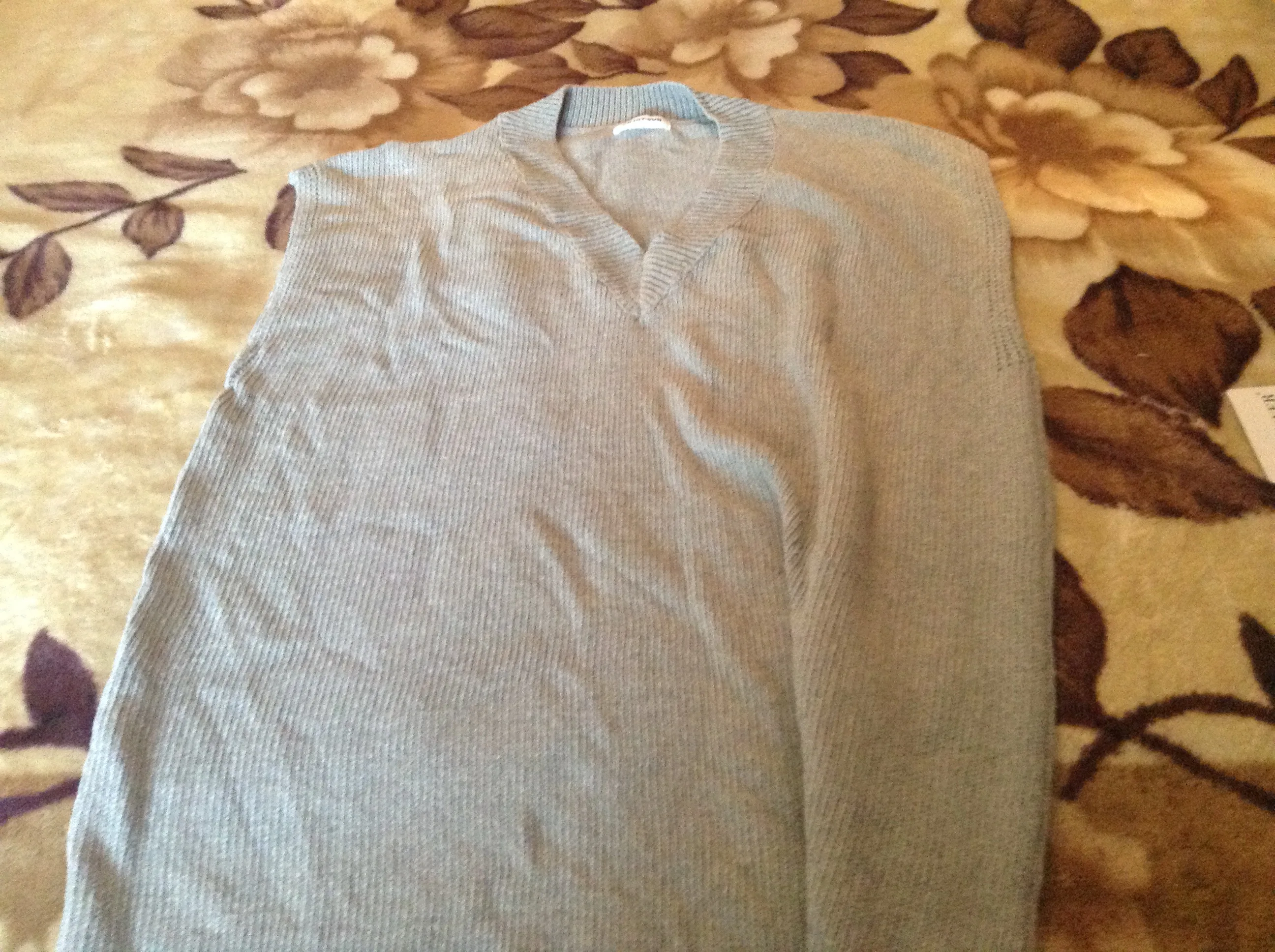 Цвет как на фото. Очень крупная вязка. На размер 48, очень сильно велик. Вырез глубокий, проймы рукавов до талии. Запах присутствует. В целом неплохо.