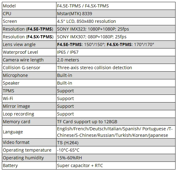 VSYS F4.5X-TPMS оснащен CPU Mstar 8339, который записывает 25 кадров в секунду в разрешении 1920x1080. Встроенный Sony IMX307 cmos-датчика изображения и 7-стеклянная линза обеспечивает четкие, гладкой и широкий отснятого видеоматериала. Значительно повышает ночное видение на низкой светильник окружающей среды, что делает вашу машину более безопасной в ночное время.● F4.5E-TPMS имеет 6-слой стеклянного объектива и SONY IMX323 КМОП-матрица.