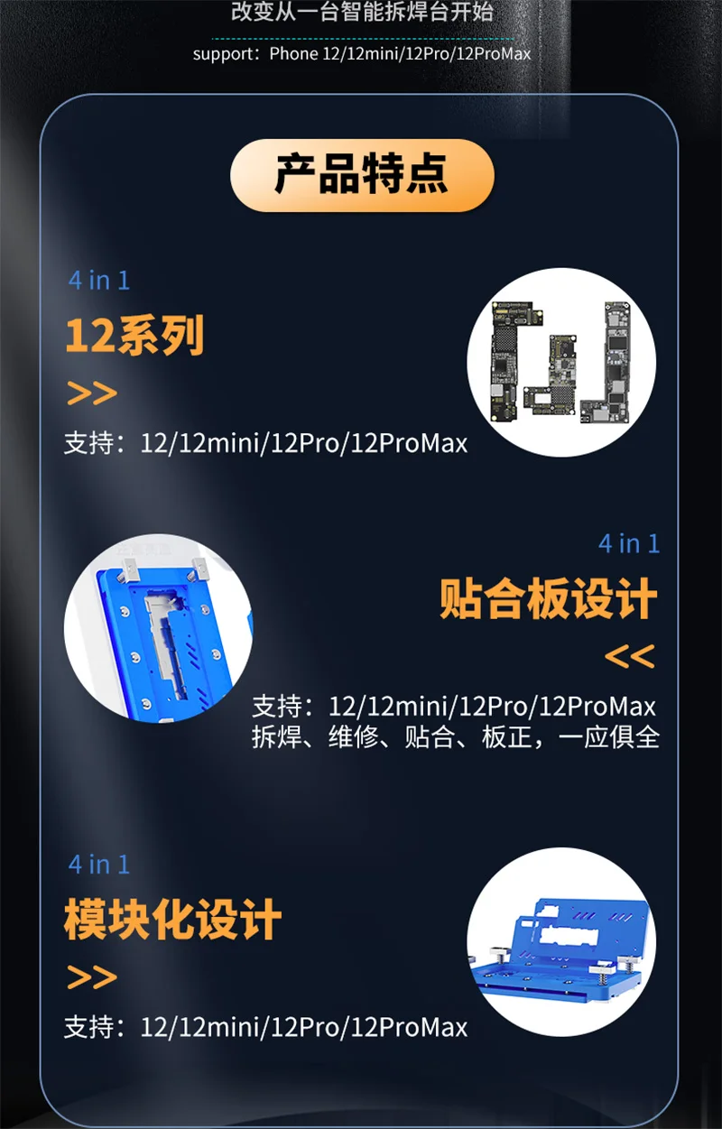 Точное позиционирование, точная температура, быстрое повышение температуры, нескользящее увеличение веса, Температура цифрового дисплея, Интеллектуальный сон 15 минут, экстремальное повышение скорости на 183 ° за три минуты, быстрое расслоение, безопасная разборка, без повреждений материнской платы.