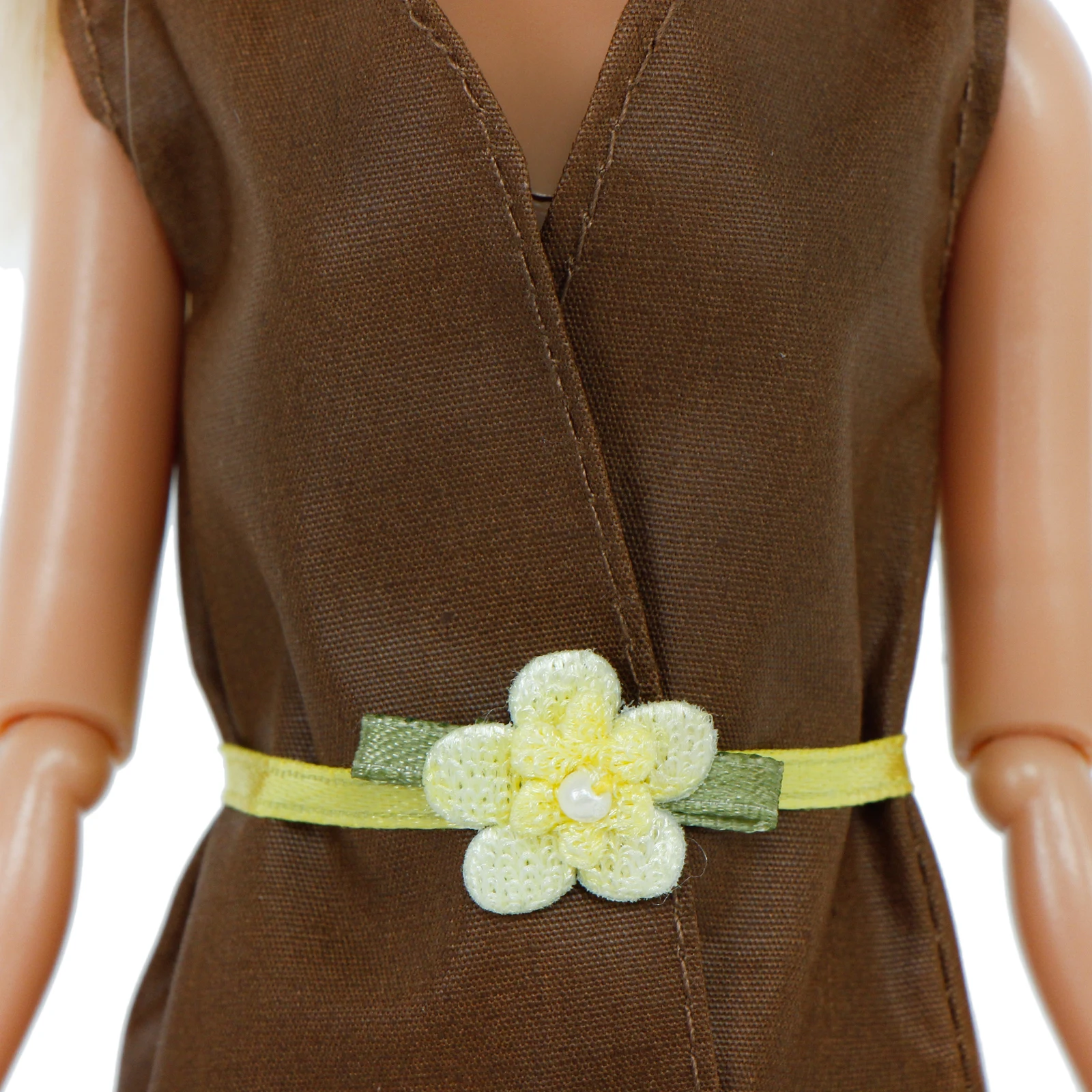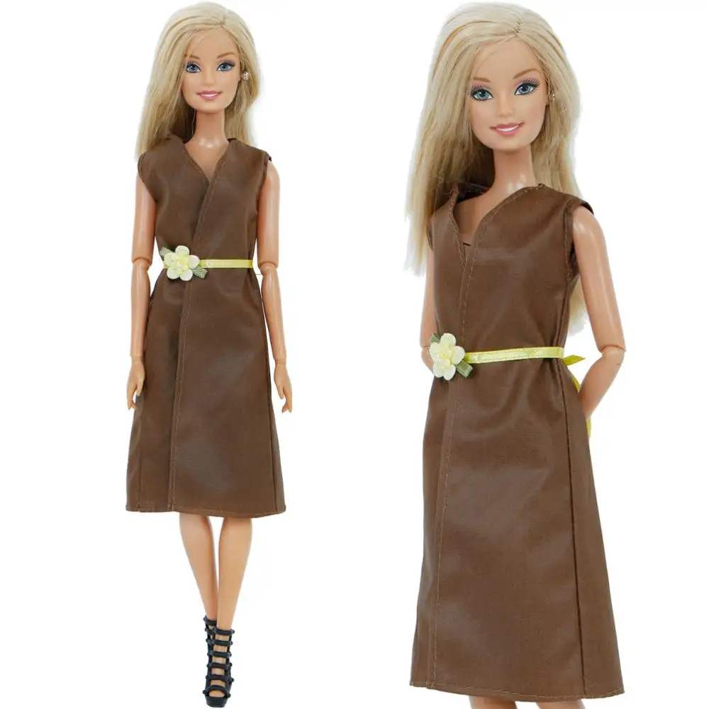 Модное коричневое платье с цветочным поясом + черные туфли на высоком каблуке, повседневная одежда, кукольный домик, Одежда для кукол Барби, аксессуары, детская игрушка