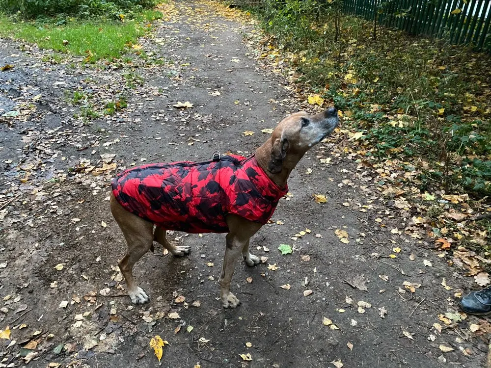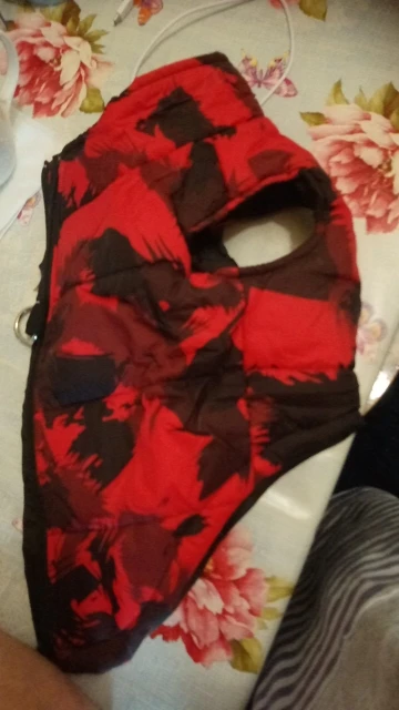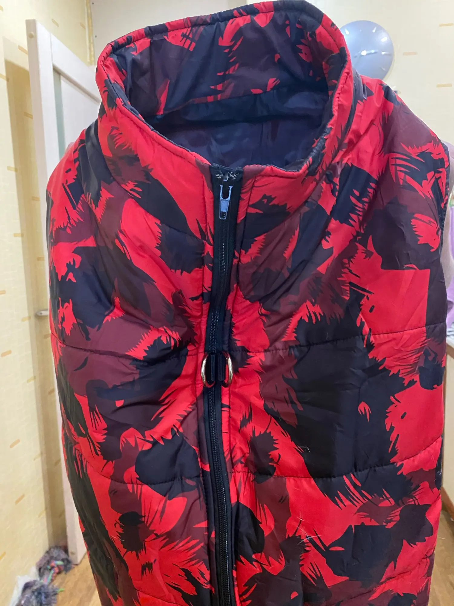 Курткой довольны, на риджбека 35 кг подошла. Сшита достаточно аккуратно; молния не очень качественная, но работает)), но я боюсь, скоро сломается, в остальном все супер. Изнутри на гладкой подкладке - не будет забиваться шерсть. Набита вроде синтепоном.