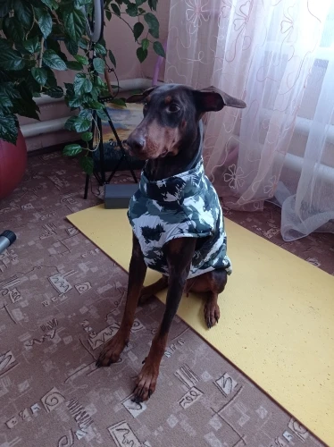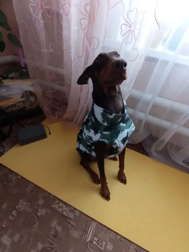 на добермана весом 20 кг взяла 5ХL немного велика, но с таким учётом и брала, до этого была желетка 4хl, уже из неё выросли. Все устраивает, у нас девочка, буду на область живота кусок ткани вшивать, чтоб теплее было, а так соски мерзнут.