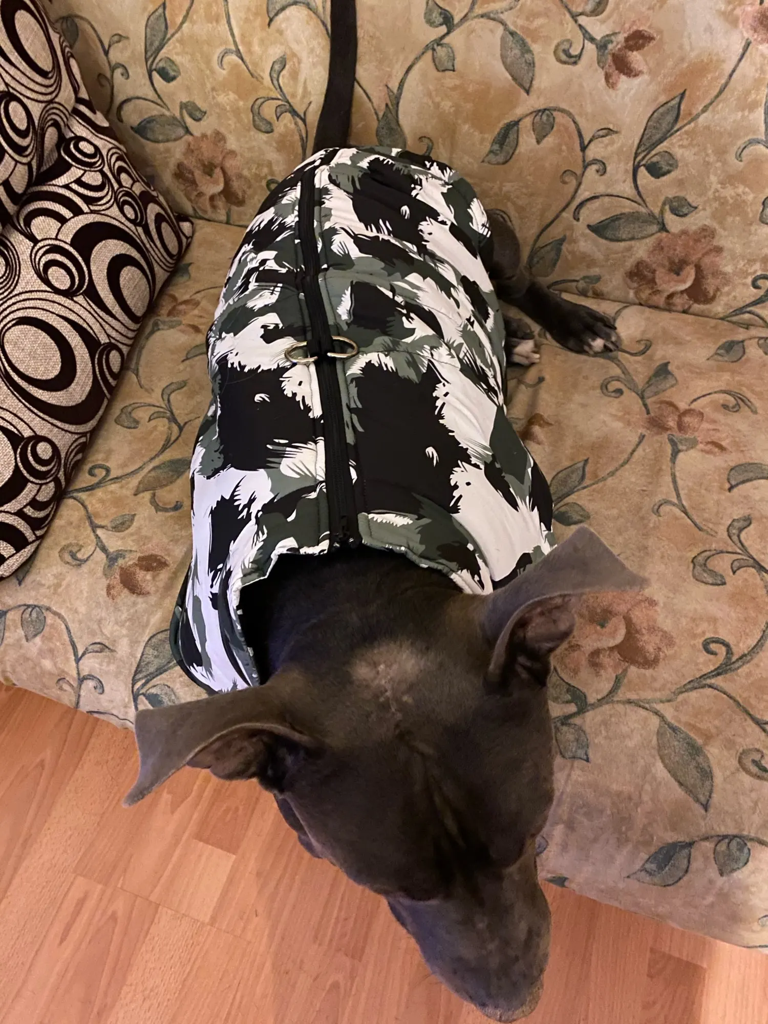 Куртка огонь! Заказала 15.12. с России, посылка доставлялась компанией КСЭ. Получила 23.12. Трек отслеживался только на сайте этой службы доставки. Заказывала 5XL на размеры: шея 47 см, грудь 73, спина 55. Все село идеально, только живот был немного большой. Исправили это с помощью резинки. В целом куртка шикарная, собаке очень тепло в ней. Рекомендую!