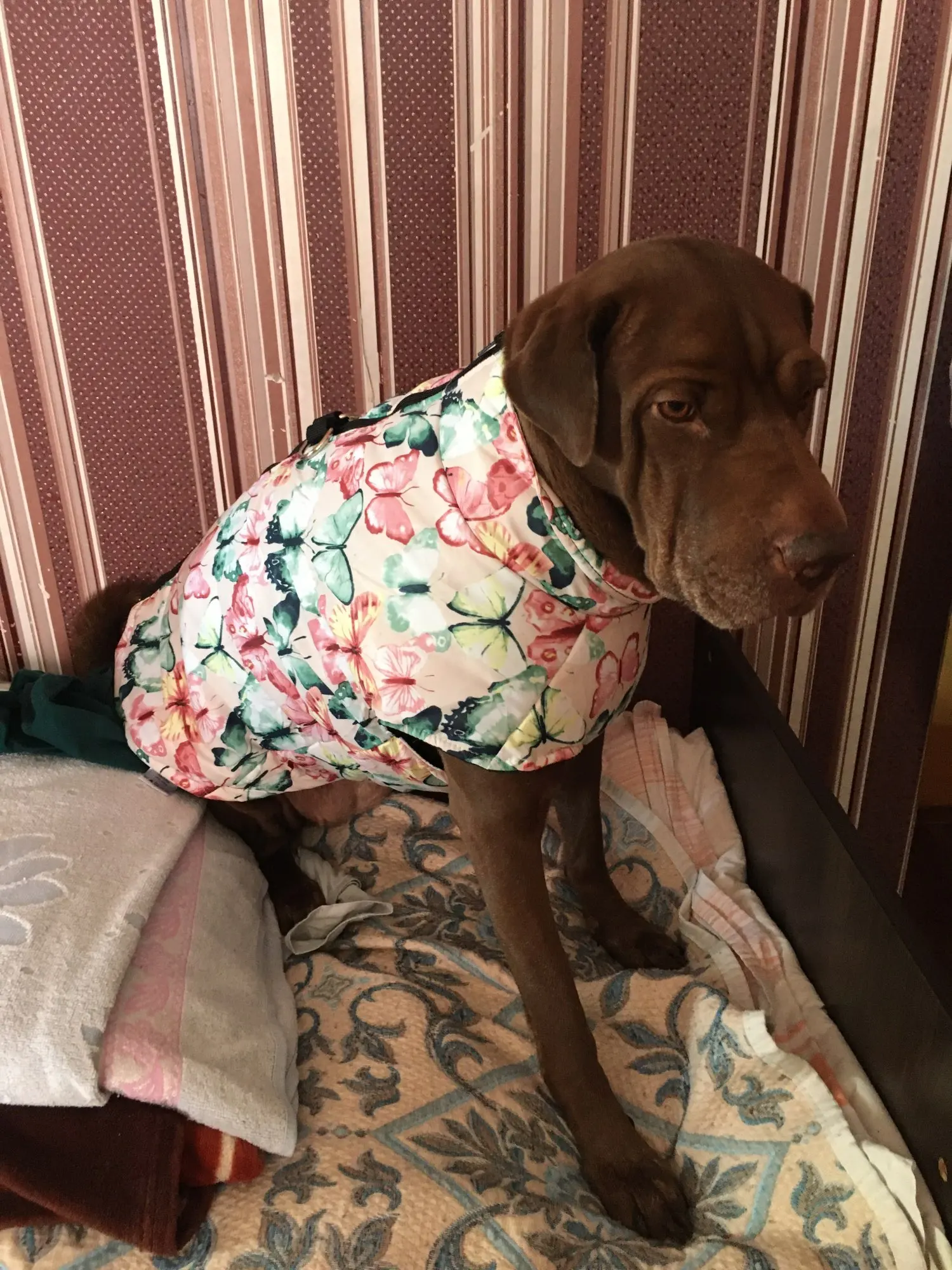 Качество хорошее. Размер 5XL подходит для мужского Лабрадора весом 32 кг. Пришел в короткие сроки.