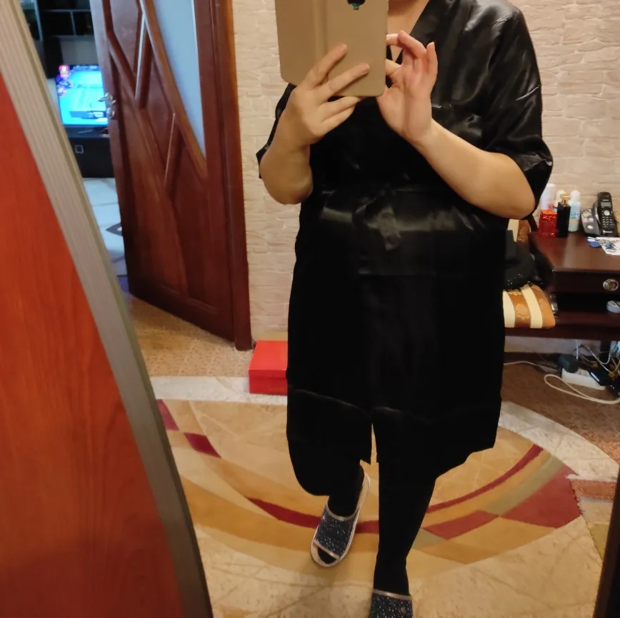 хороший халатик, очень тонкий, к телу приятный, сохнет за три секунды. Размер XXL подошёл на 114-86-116, но немного распахивается снизу, т.к. скользкий, по идее, к нему надо сорочку) на рост 163 ровно по колено. пришёл за три недели на Урал.